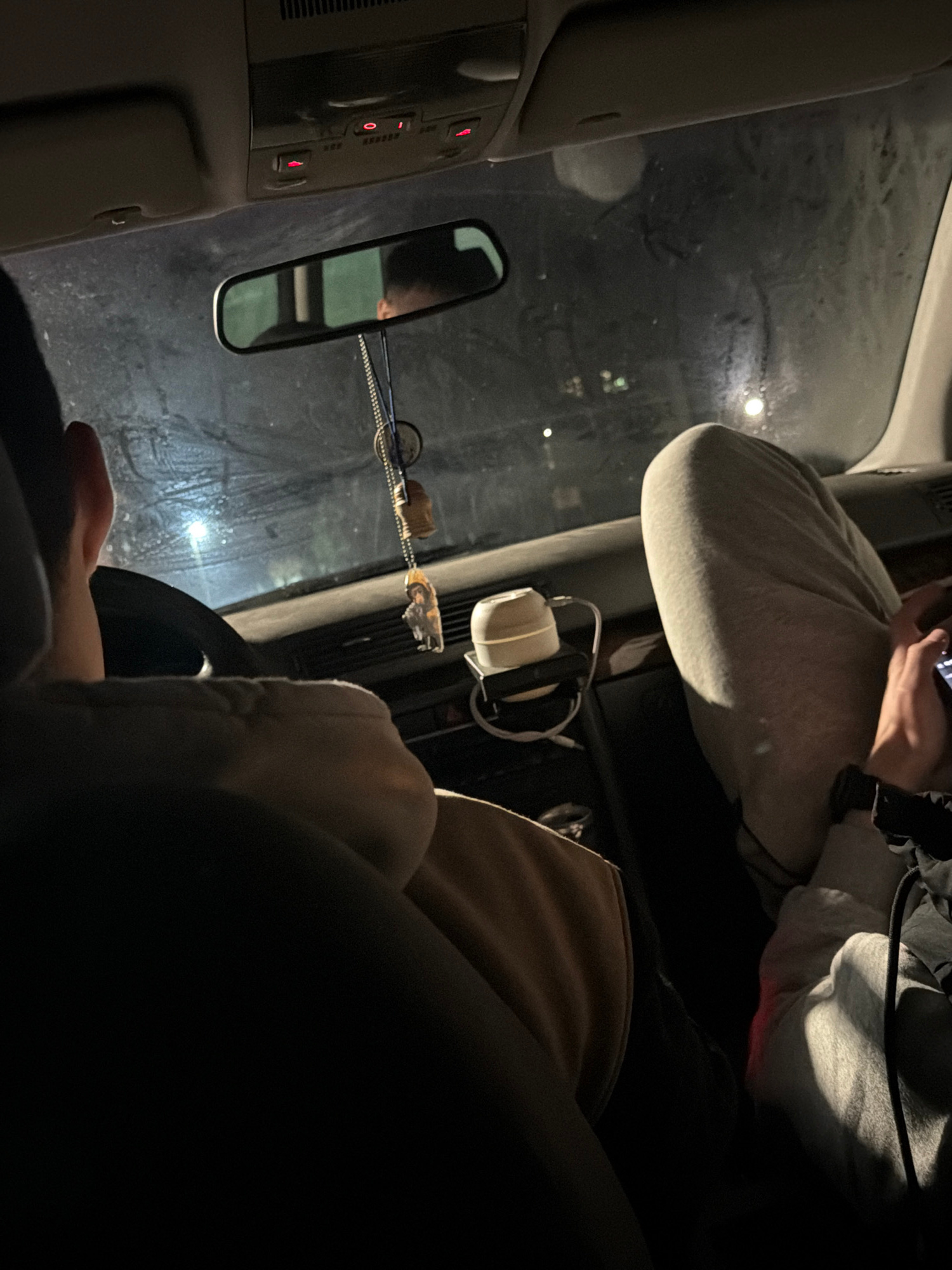 The image depicts the interior of a car. Two people are visible, one in the passenger seat using a phone and wearing a light gray hoodie. The second person is in the back, wearing brown pants, a black…read more