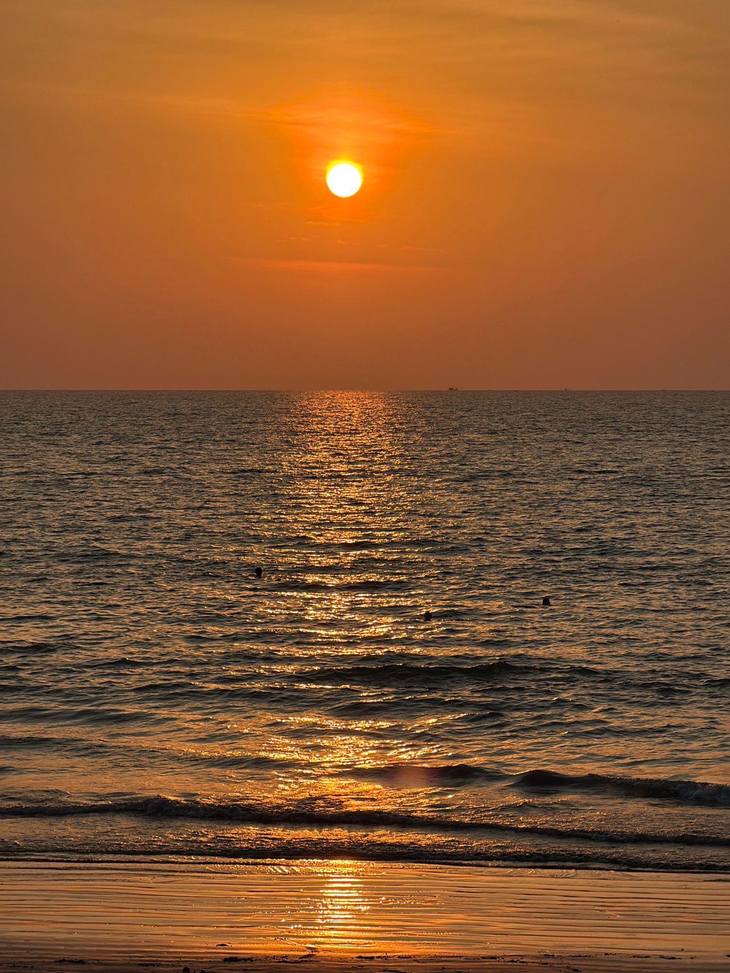 The image captures a sunset scene over the Andaman Sea at Kamala Beach in Kamala, Thailand. A brilliant, circular sun, emitting a bright white-orange light, is positioned slightly above the horizontal…read more