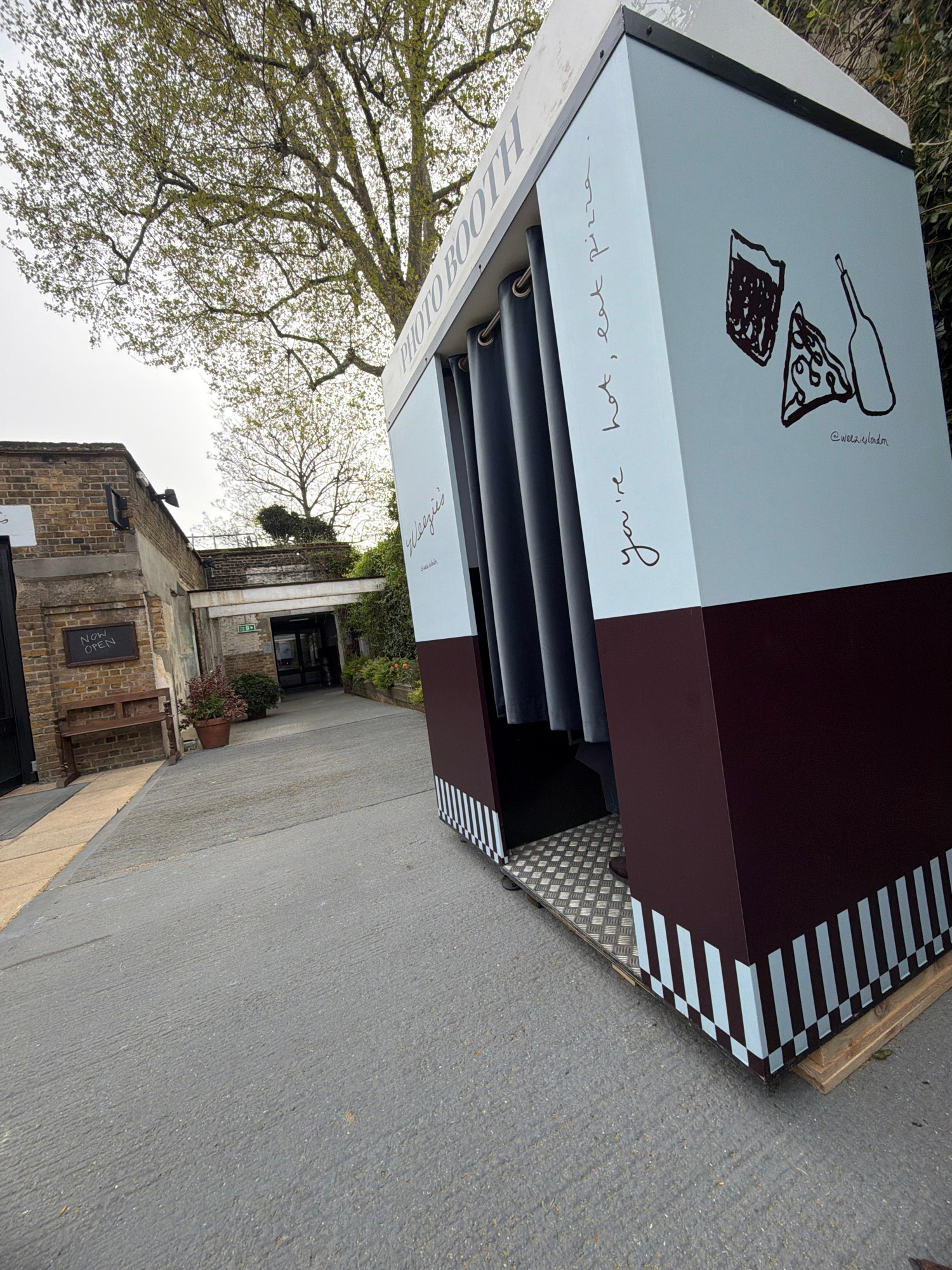 A photo booth sits on the pavement next to a building, with the brand name 'Mojeez' written on the booth. The booth is painted white and dark brown, with a pizza drawing and the words, "You're hot, ea…read more