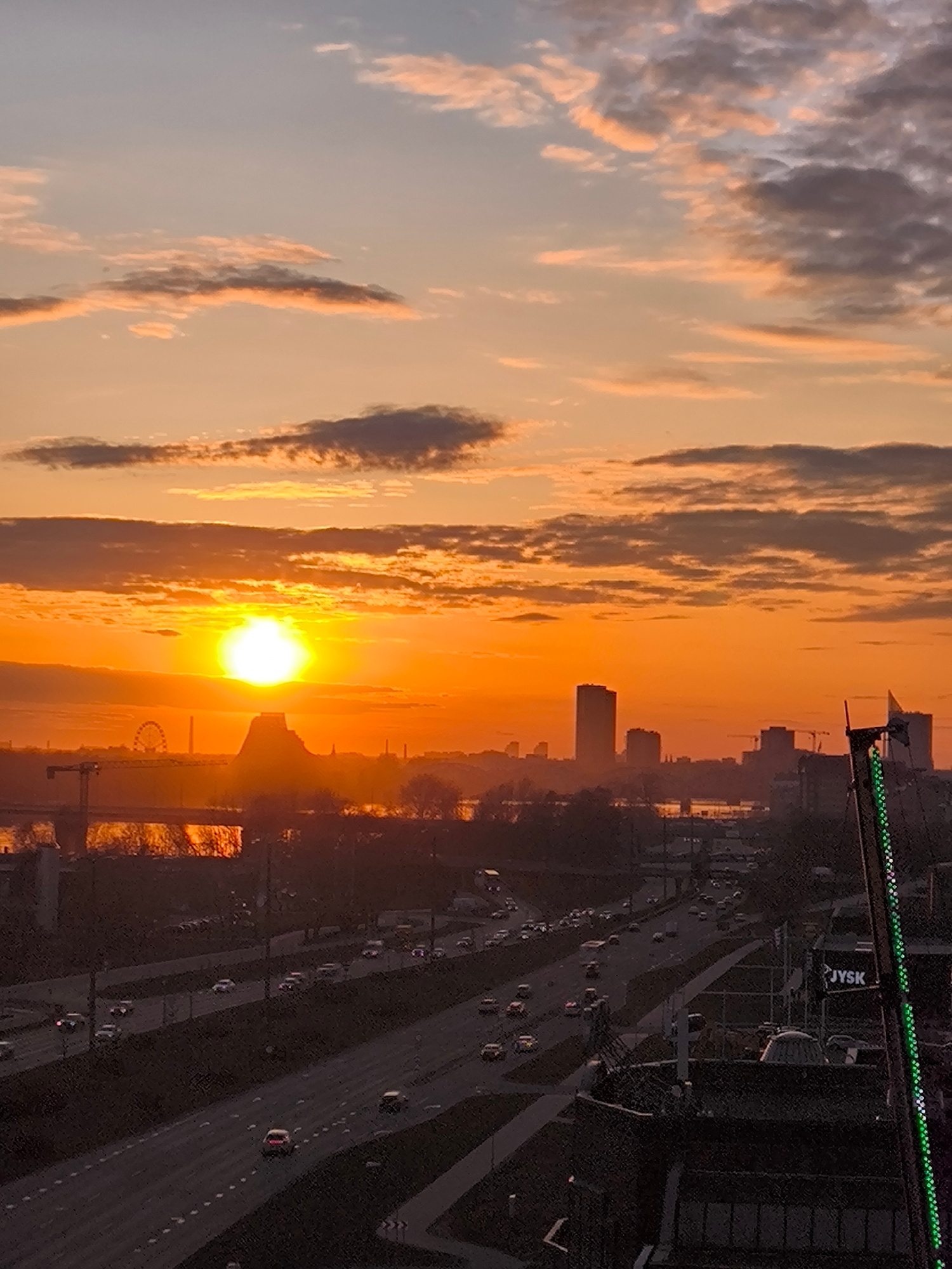 The image shows a sunset over Riga, Latvia. The sun is setting on the horizon, casting an orange glow over the sky and the city. Clouds are present in the sky. In the background, the skyline of Riga i…read more