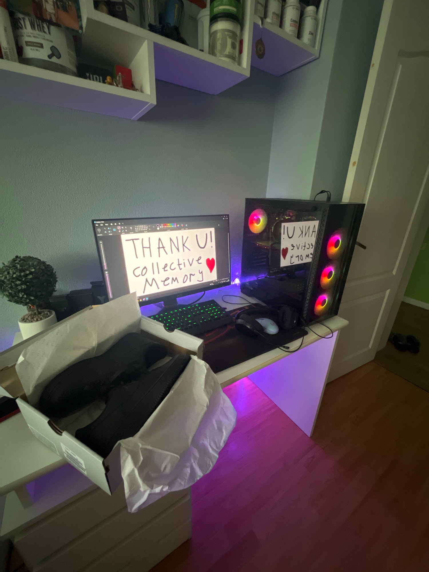 A computer setup is pictured, with a monitor displaying "THANK U! Collective Memory" and a heart symbol. A pair of black shoes are in an open shoe box on the desk. A computer tower with RGB fans has a…read more