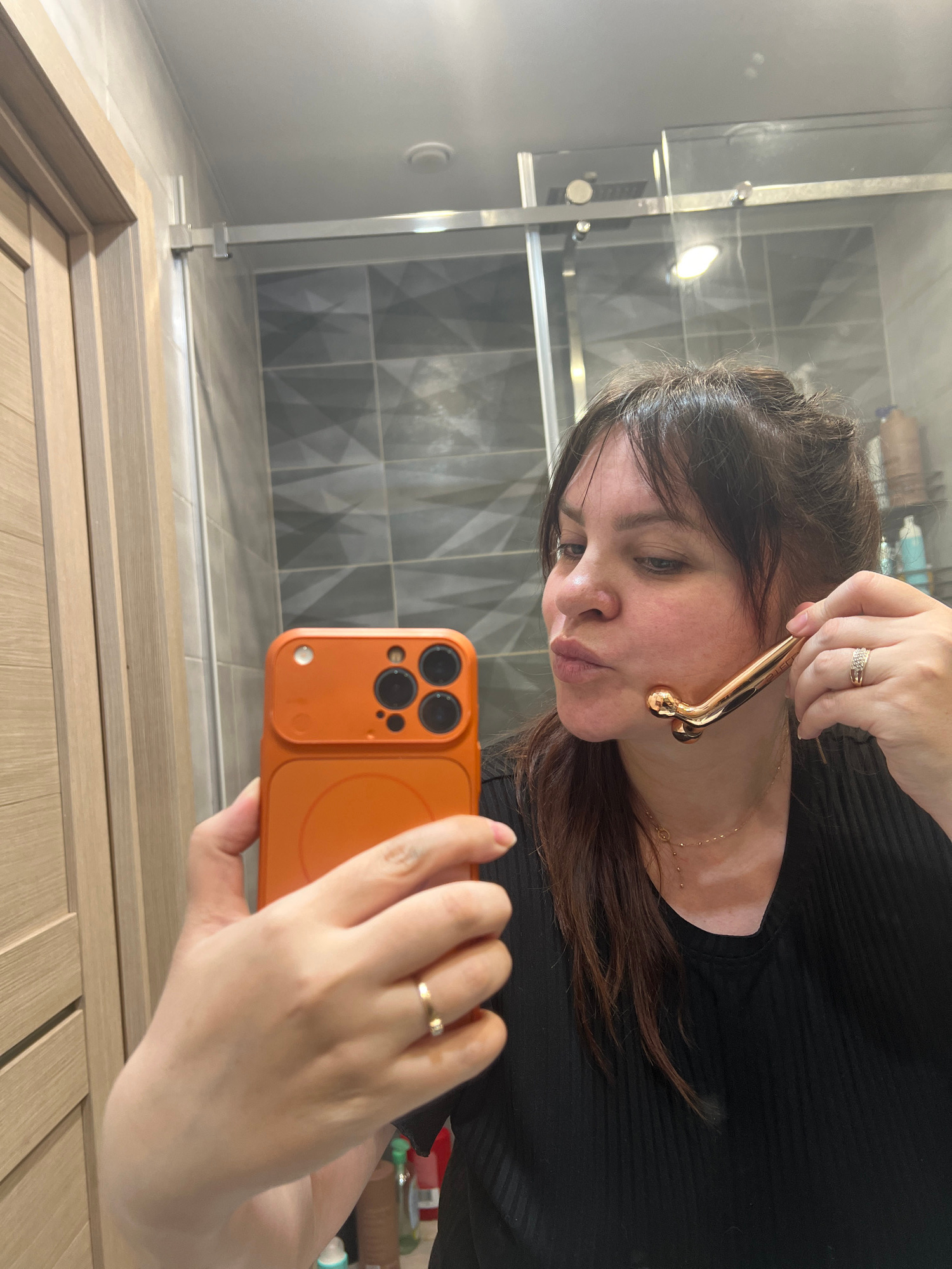 A woman is using a gold facial roller on her face while taking a selfie with an orange cell phone in a bathroom. The bathroom has a shower with gray geometric patterned tiles. The cabinets are made of…read more
