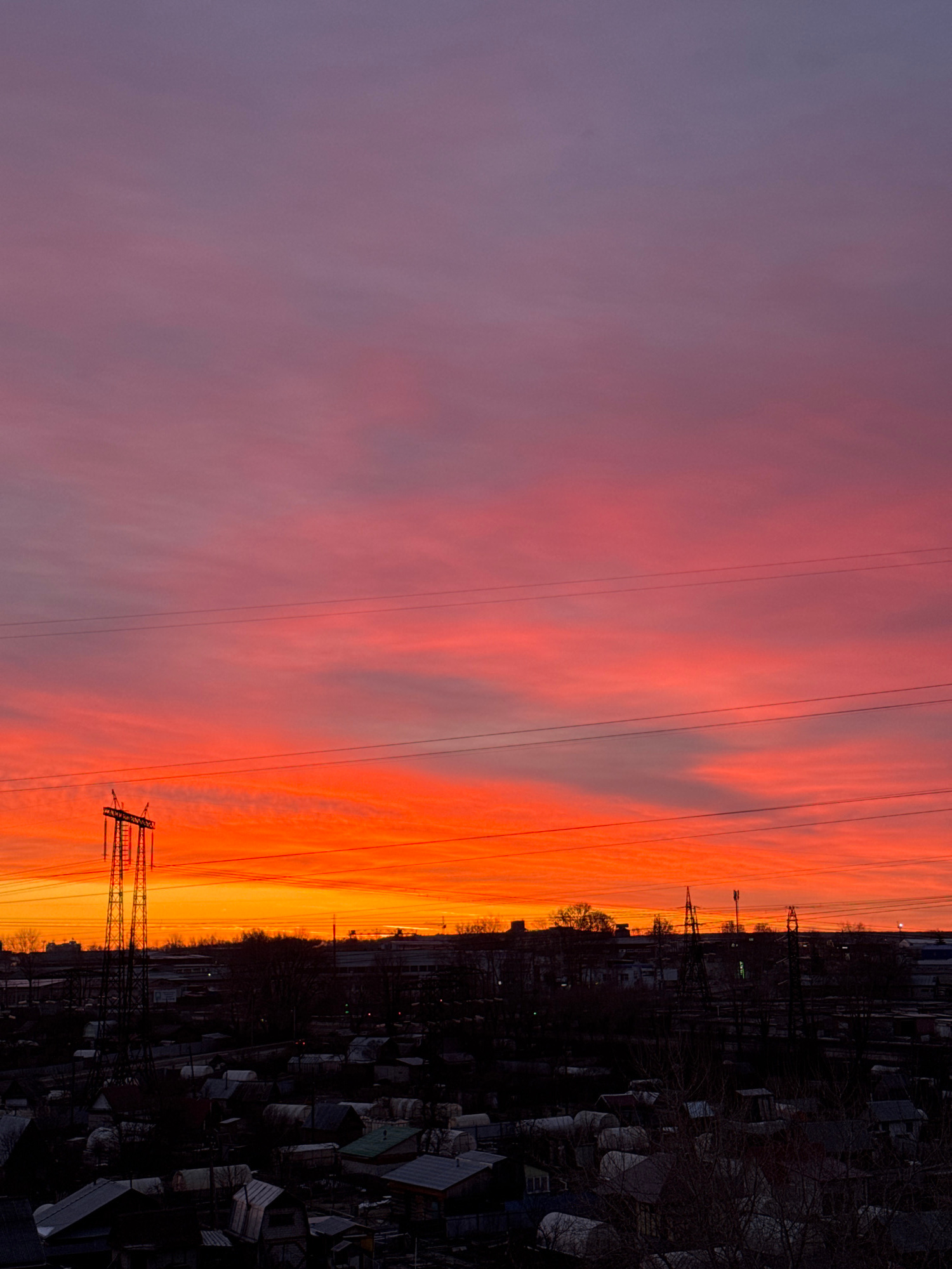 The image shows a vivid sunset in Chaikovsky, Russia. The sky transitions from a pale purple-gray in the upper left to a fiery orange-red closer to the horizon. Power lines stretch across the frame, s…read more