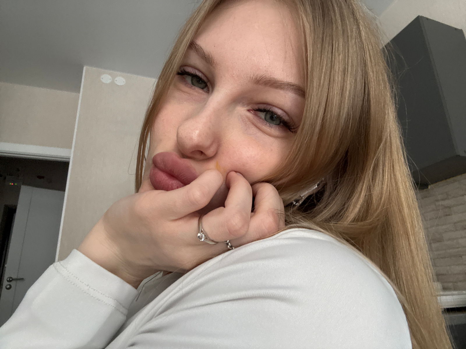 A close-up, upside-down selfie of a Caucasian woman with blonde hair and green eyes. She is wearing a light-colored, long-sleeved shirt and two rings on her fingers. She is holding the bridge of her n…read more