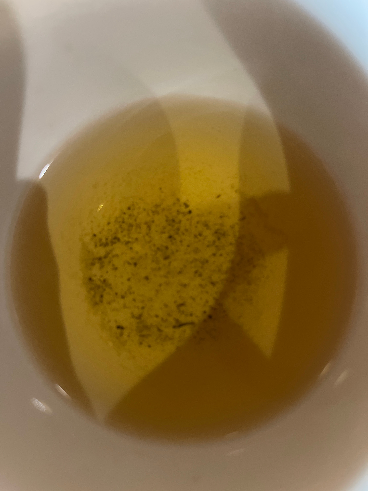 A top-down view of a white ceramic bowl filled with a translucent, yellow-brown liquid, possibly tea or broth. Dark, particulate matter is suspended within the liquid, concentrated in the center. The…read more
