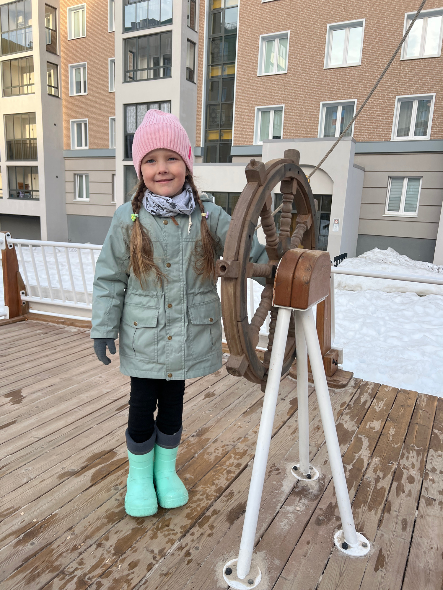 An outdoor scene in Pervomaysky, Russia, depicts a young female child standing on a wooden deck next to a large, freestanding wooden ship's steering wheel. The child, estimated to be 4-7 years old, we…read more