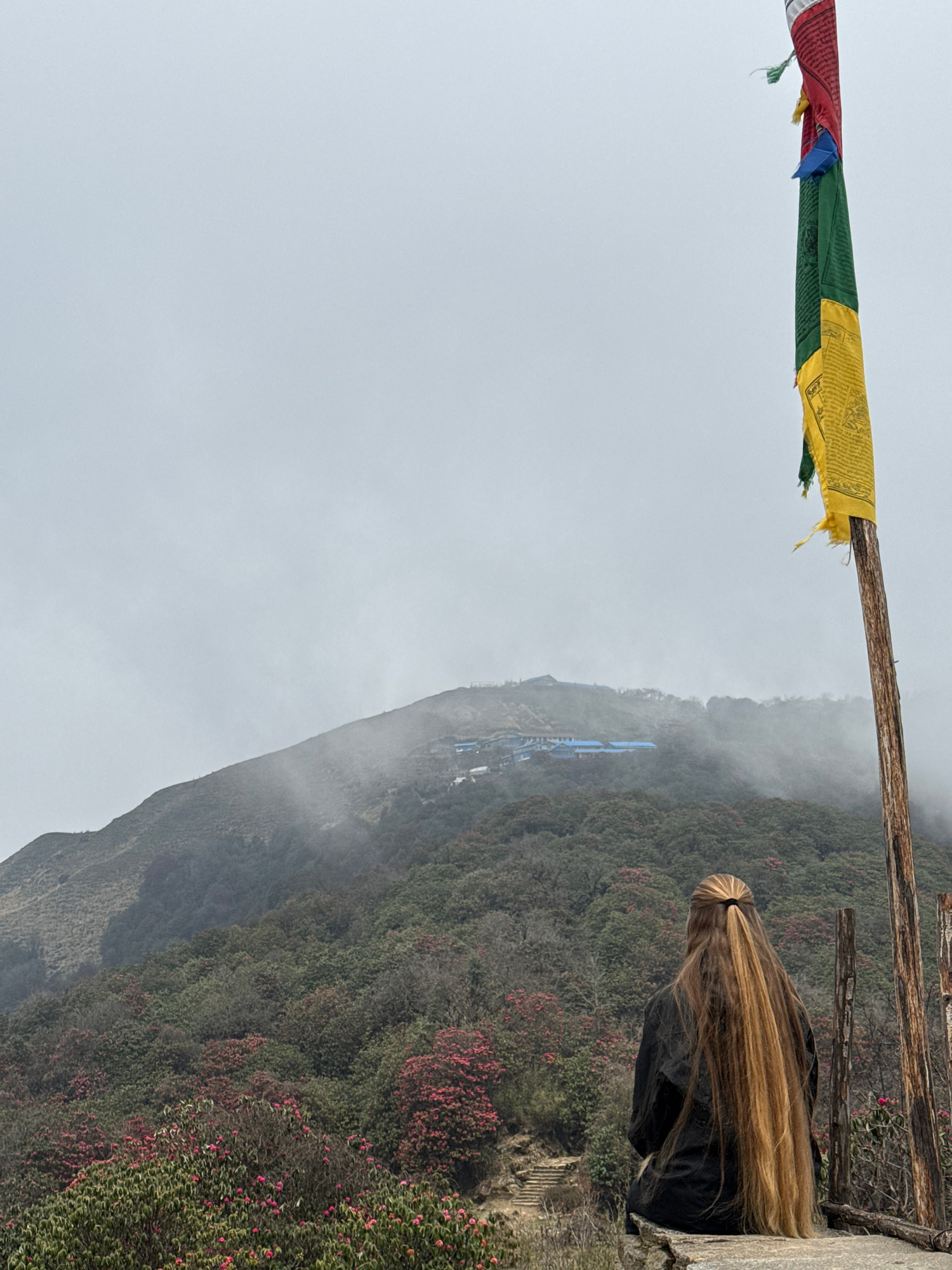 A person with long, light brown hair, tied in a half-ponytail, is observed from behind, looking out over a vast, misty mountainous landscape. They are wearing a dark jacket and appear to be sitting or…read more