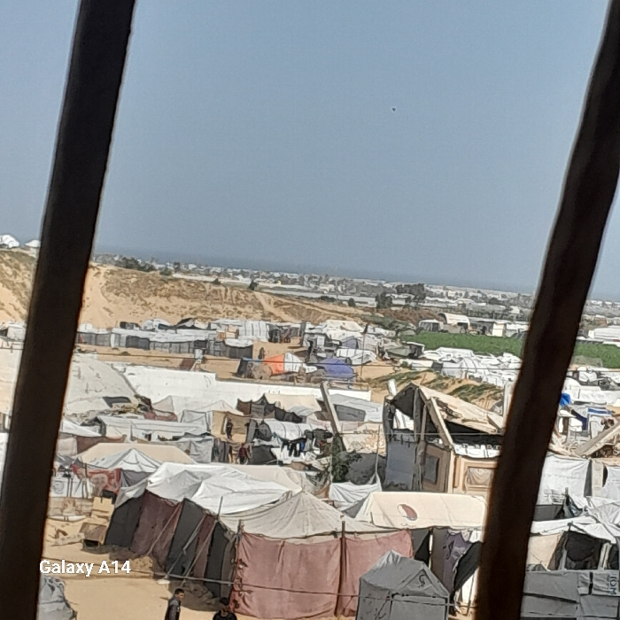 The image displays an expansive, densely populated displacement camp in Khan Yunis, Palestinian Territory, viewed from an elevated perspective, partially framed by two dark, vertical foreground obstru…read more
