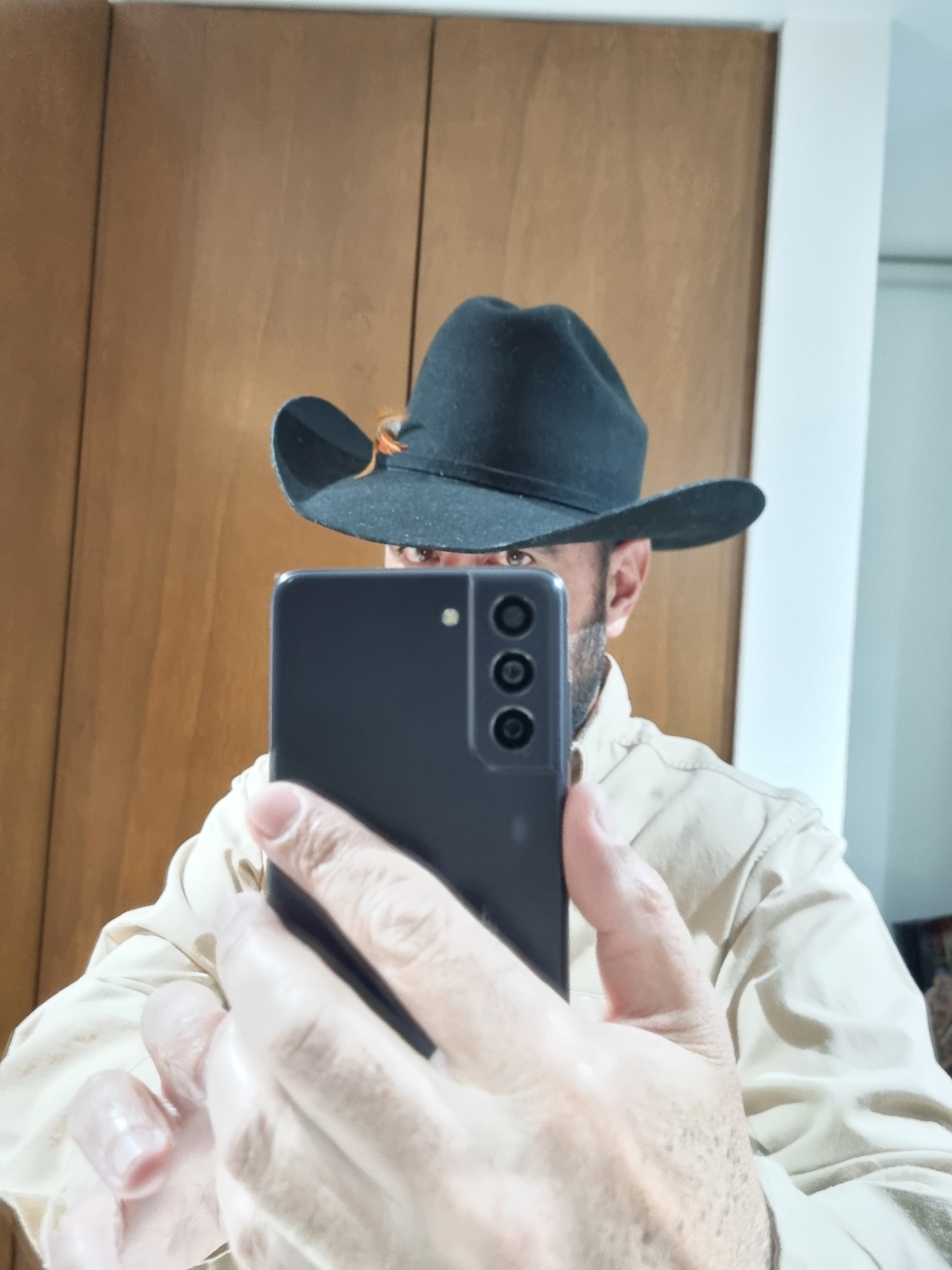 A person wearing a black cowboy hat is taking a selfie with a dark gray smartphone. The person is wearing a light brown or beige jacket or shirt. A wooden paneled wall is visible in the background. Th…read more