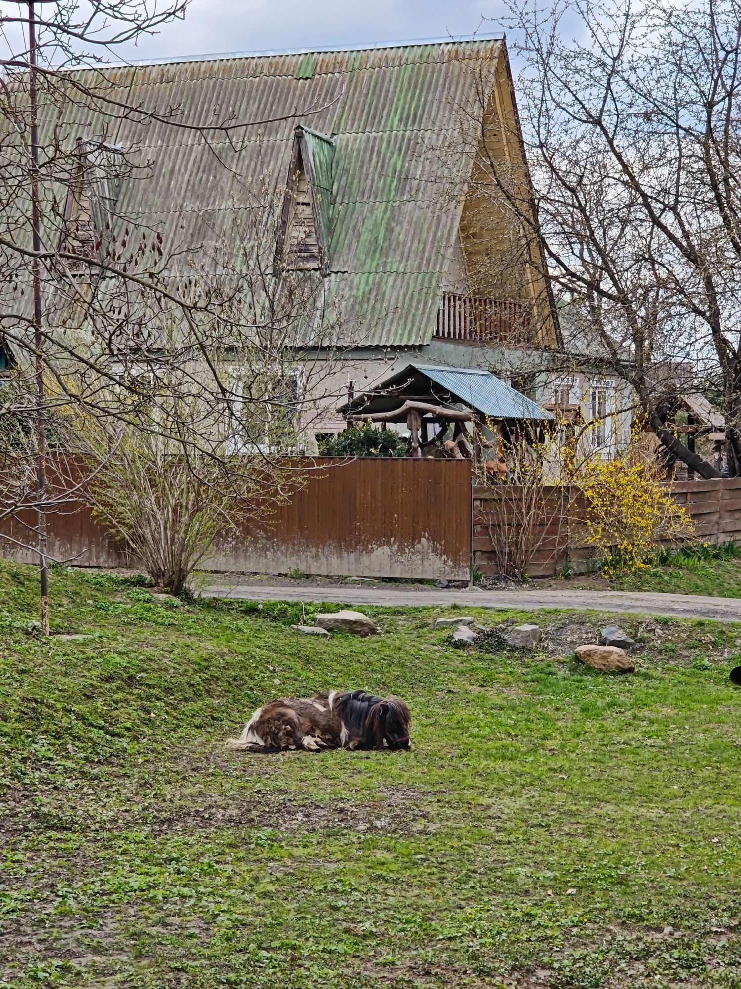In Khrinivka, Ukraine, two ponies lie on a grassy, slightly muddy slope in front of a weathered house with an aged, gray corrugated metal roof. The house features a distinctive upper level with dormer…read more