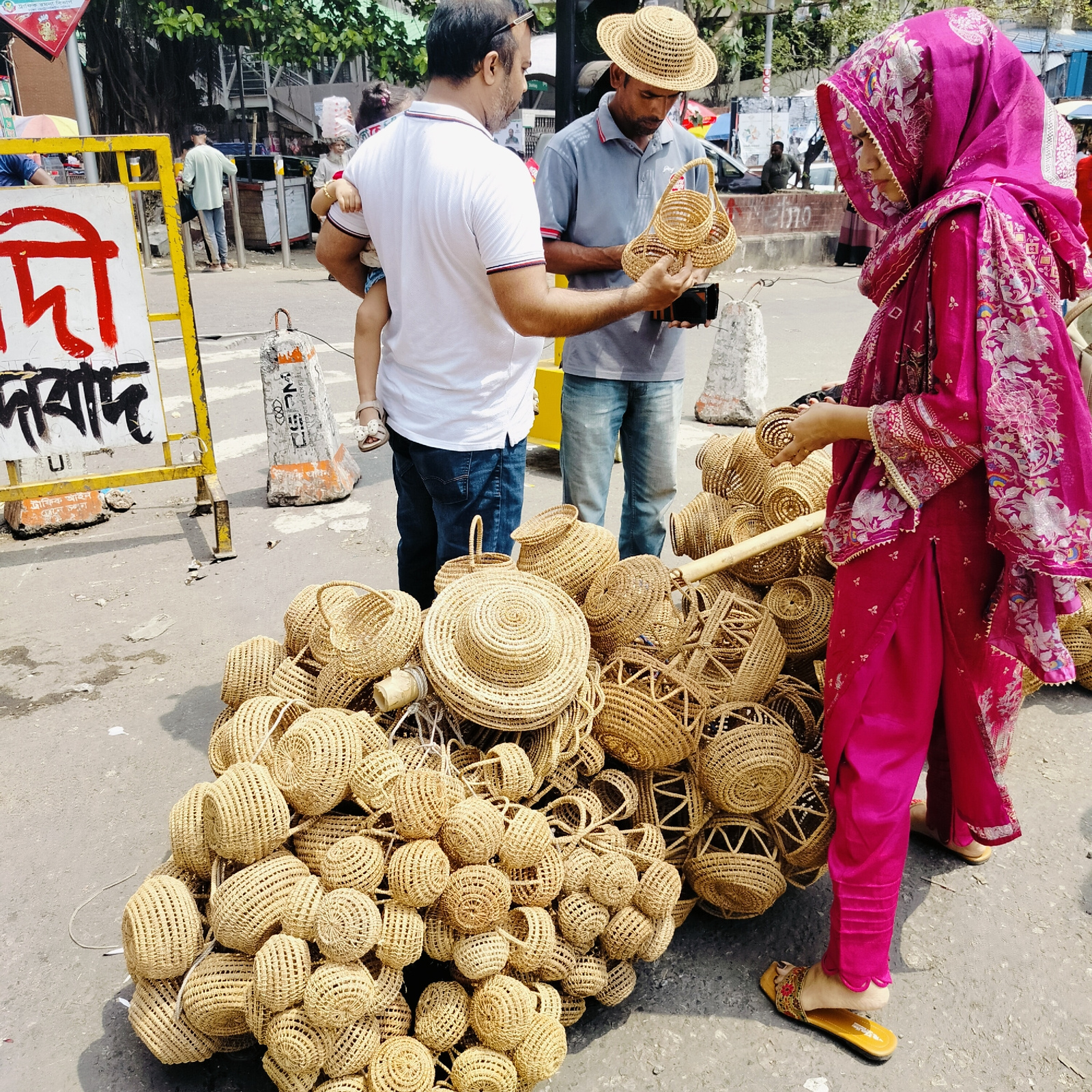 The image depicts a street scene in Dhaka, Bangladesh. A pile of woven baskets and hats occupies the foreground. A woman in a pink salwar kameez examines a basket from the pile. A man in a grey shirt…read more