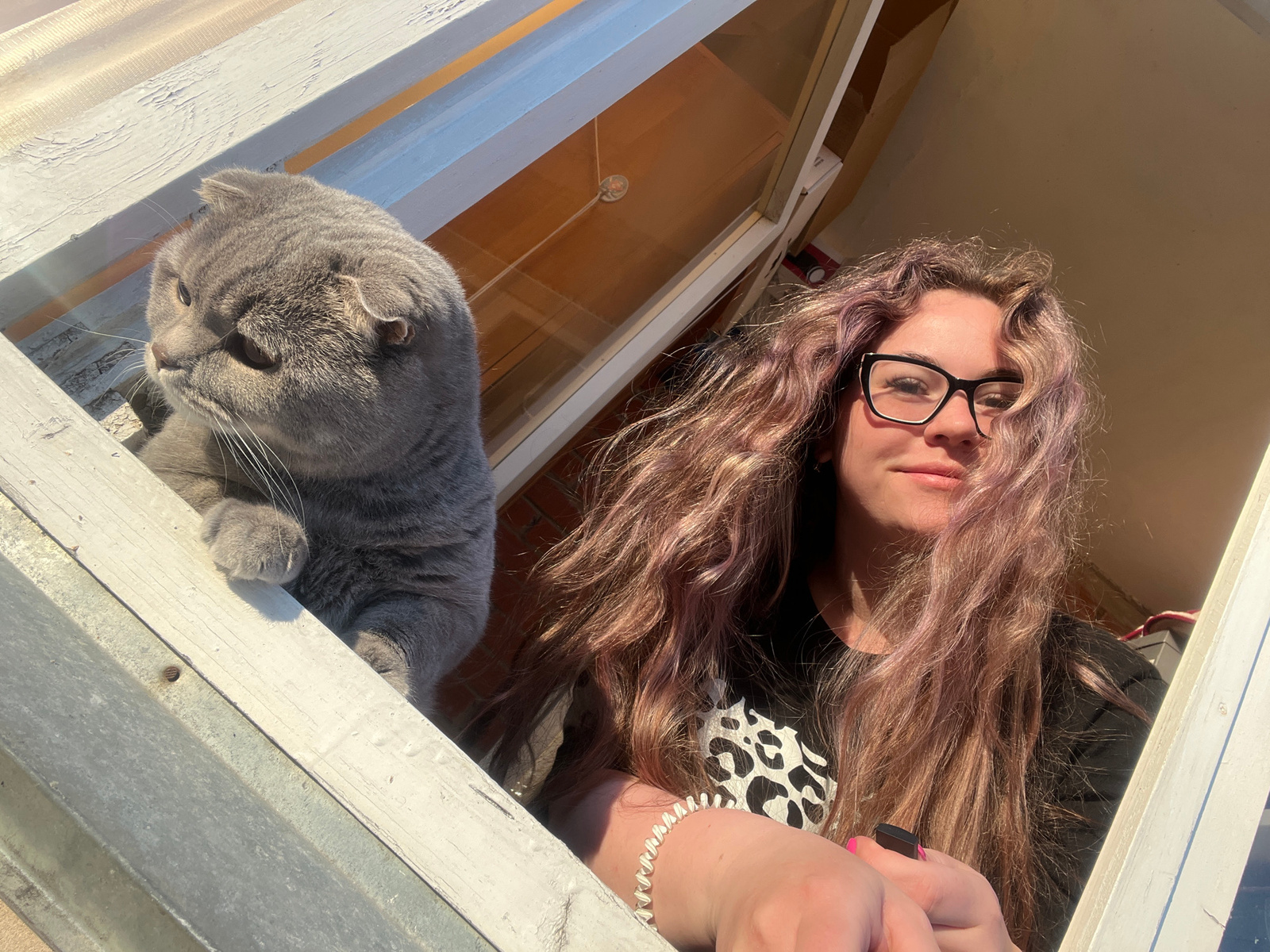 A woman and a cat are in the frame. The woman is on the right side of the image, wearing glasses and a black t-shirt with a white animal print. Her long hair is a mix of brown and light purple. She is…read more
