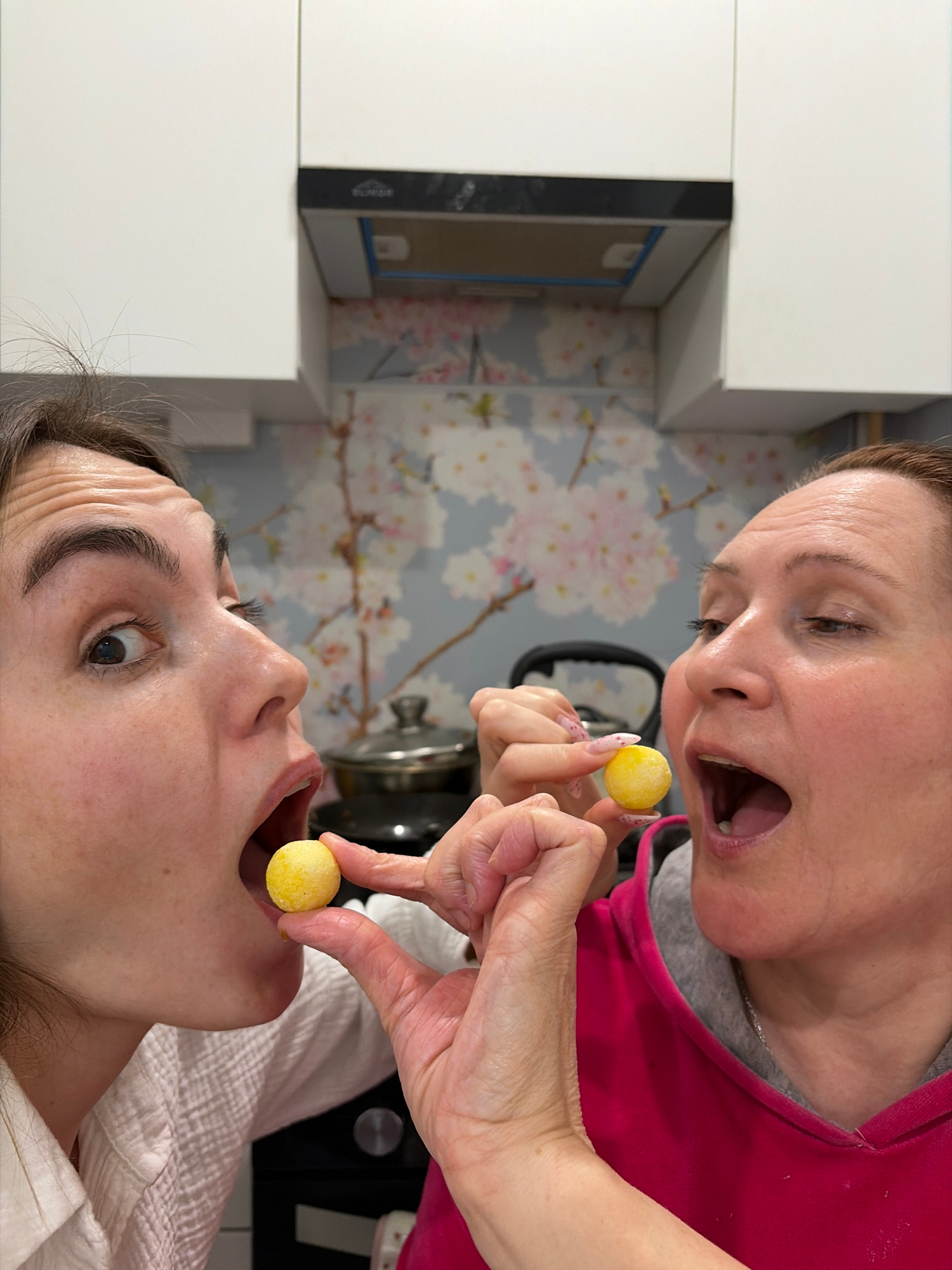 Two women are indoors in a kitchen, likely within an apartment, in Neftekamsk, Russia. One woman in a red sweater is holding a yellow ball close to the open mouth of the other, who is lying down. The…read more