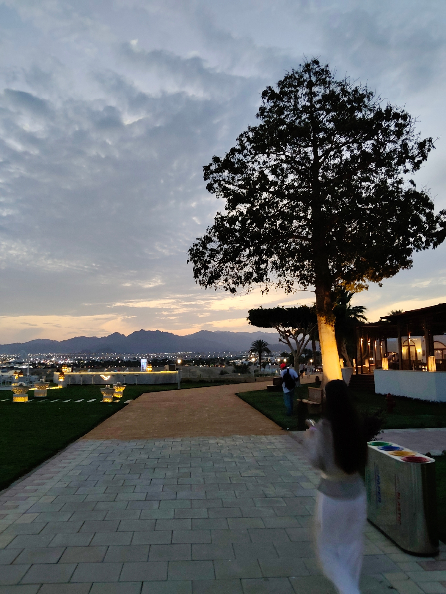 The image captures a twilight scene in Sharm El Sheikh, Egypt. In the background, the city lights twinkle at the base of silhouetted mountains, set against a cloudy sunset sky. A large tree dominates…read more