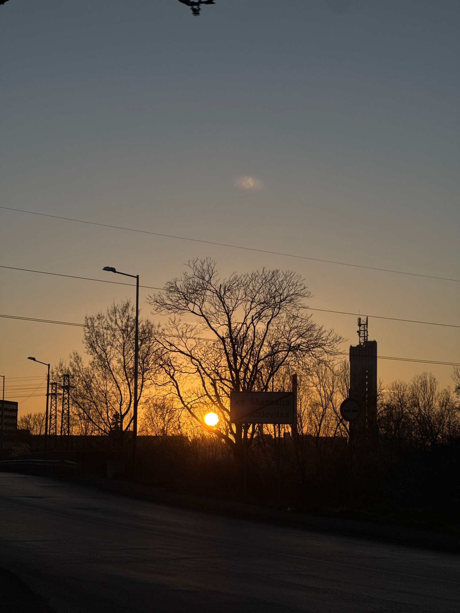 The image depicts a street scene in Busmantsi, Bulgaria, taken during sunrise or sunset. The sun is partially obscured by bare trees, casting a golden glow on the sky. Several utility poles and power…read more