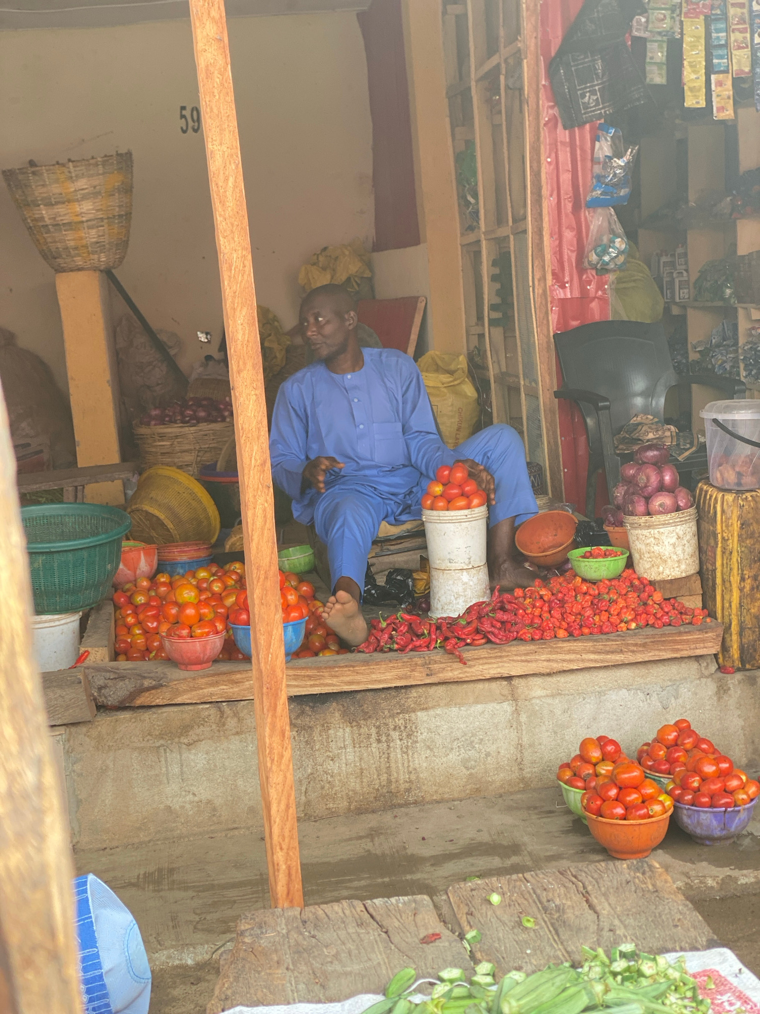 The image depicts a bustling market stall in Kafanchan B, Nigeria, seen from a slightly elevated perspective. The central subject is a man, likely a vendor, dressed in a blue traditional Nigerian outf…read more
