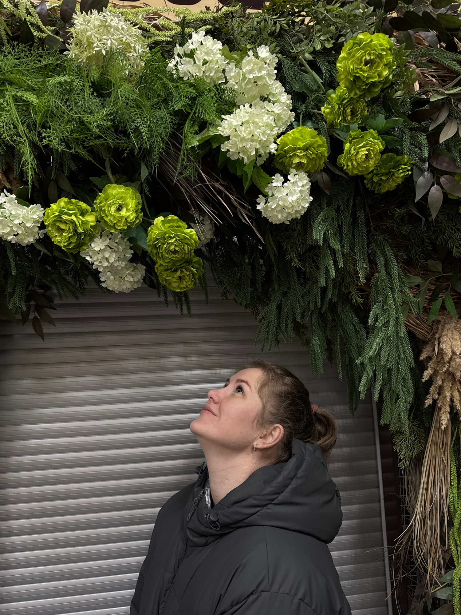 A woman in a black hooded jacket is looking at an arrangement of green and white flowers and greenery. The background appears to be a wall of vertical metal panels. The location is Горный, Russia.