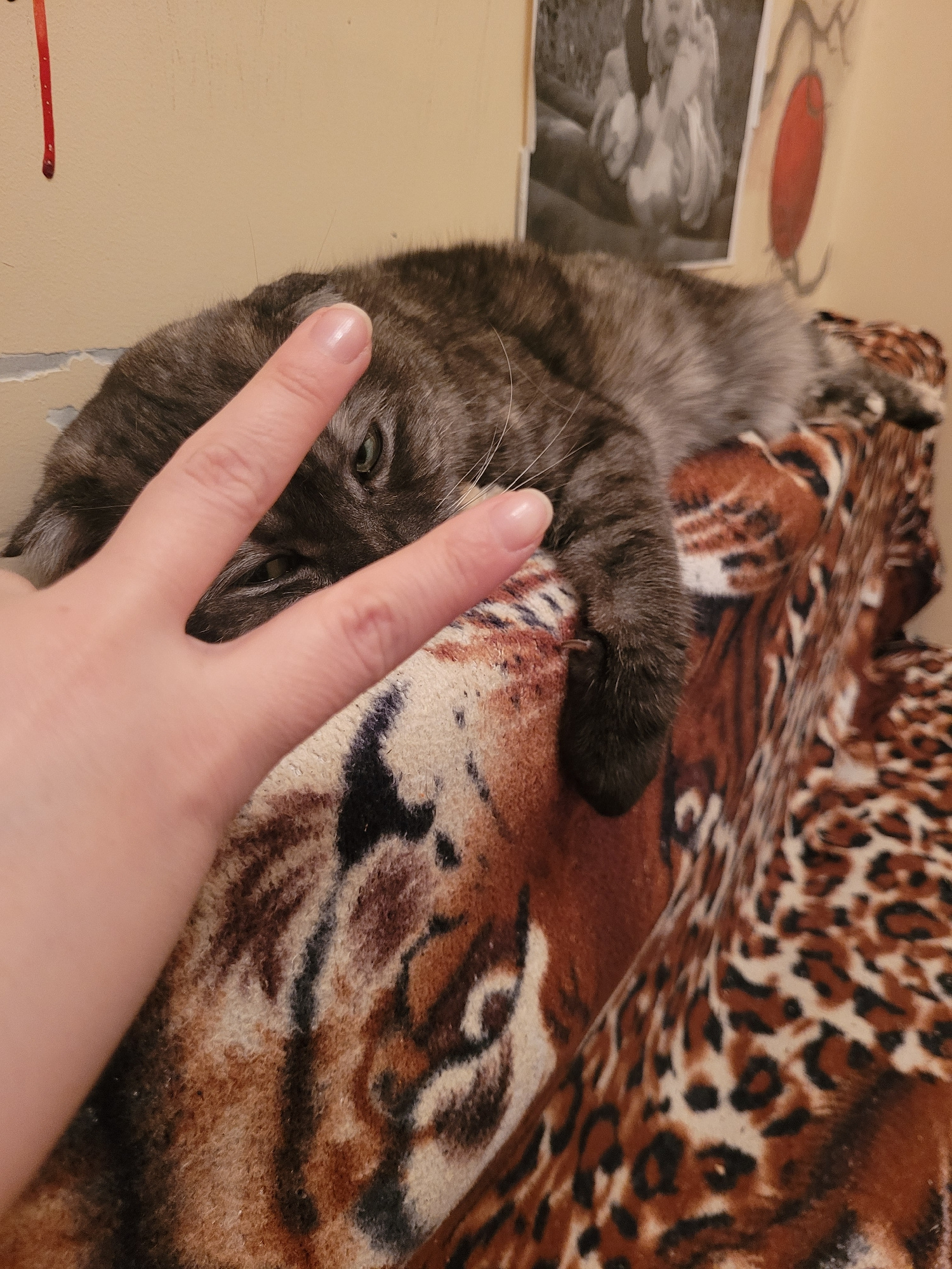 A close-up, indoor photograph shows a partially obscured gray cat on a brown and black patterned blanket. A human hand is in the foreground, displaying the peace sign. The cat's face is partly covered…read more