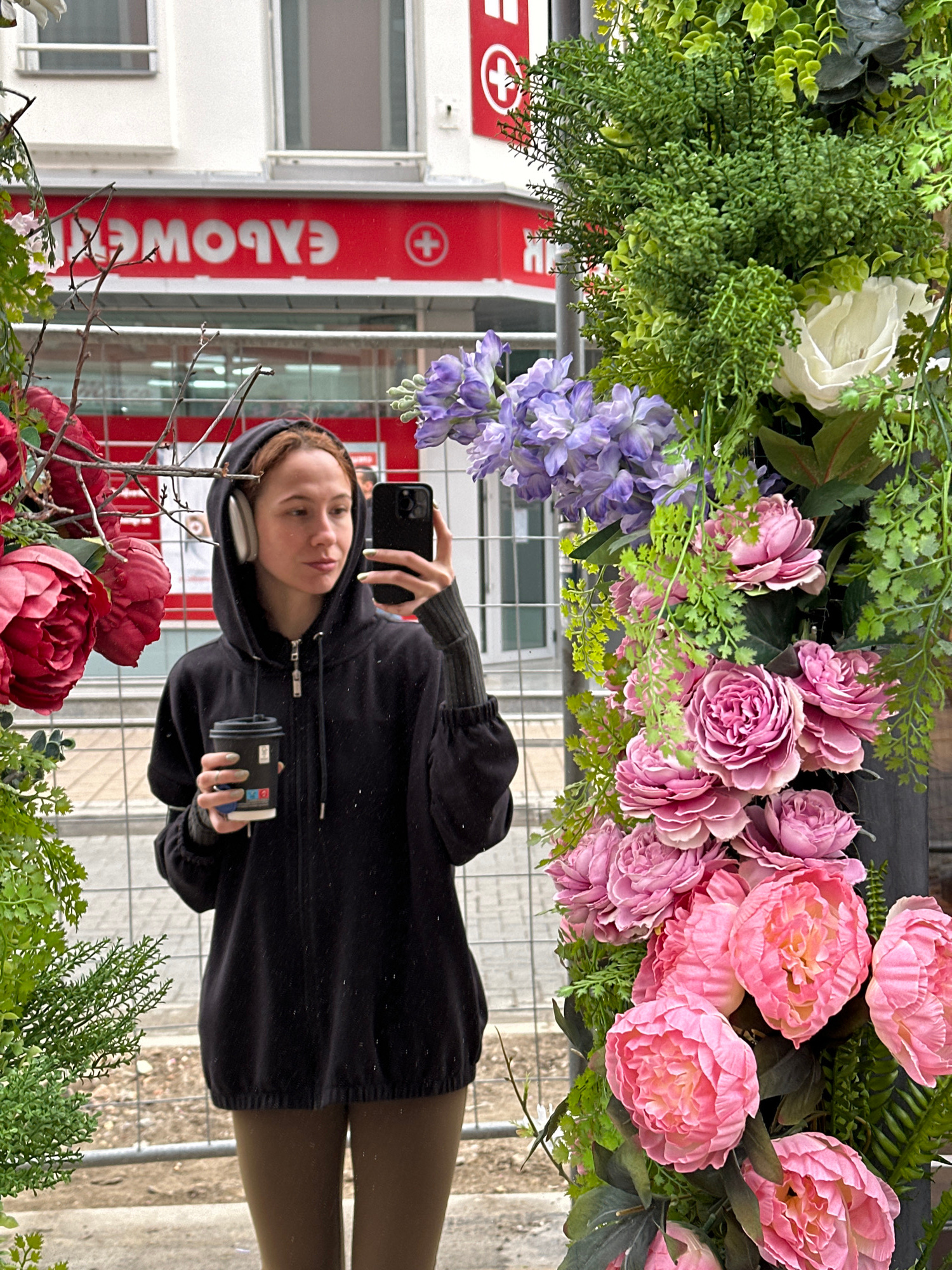 A person is taking a selfie in a mirrored surface. The person is wearing a black hoodie, headphones, and brown pants. They are holding a black phone in one hand and a black cup in the other. The backg…read more