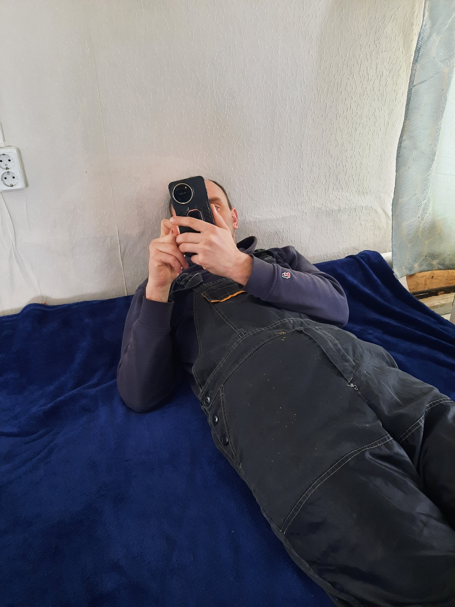 A person lies on a bed, taking a picture with their smartphone. The bed is covered in a white textured blanket and a blue fleece blanket. The person is wearing dark overalls and a dark blue long-sleev…read more