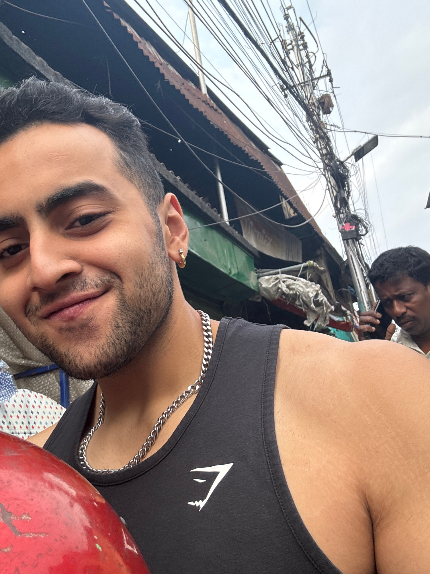 A selfie captures two men against a backdrop of a building with dense, entangled electrical wires. The primary subject is a younger man in the foreground wearing a black tank top with a silver chain.…read more