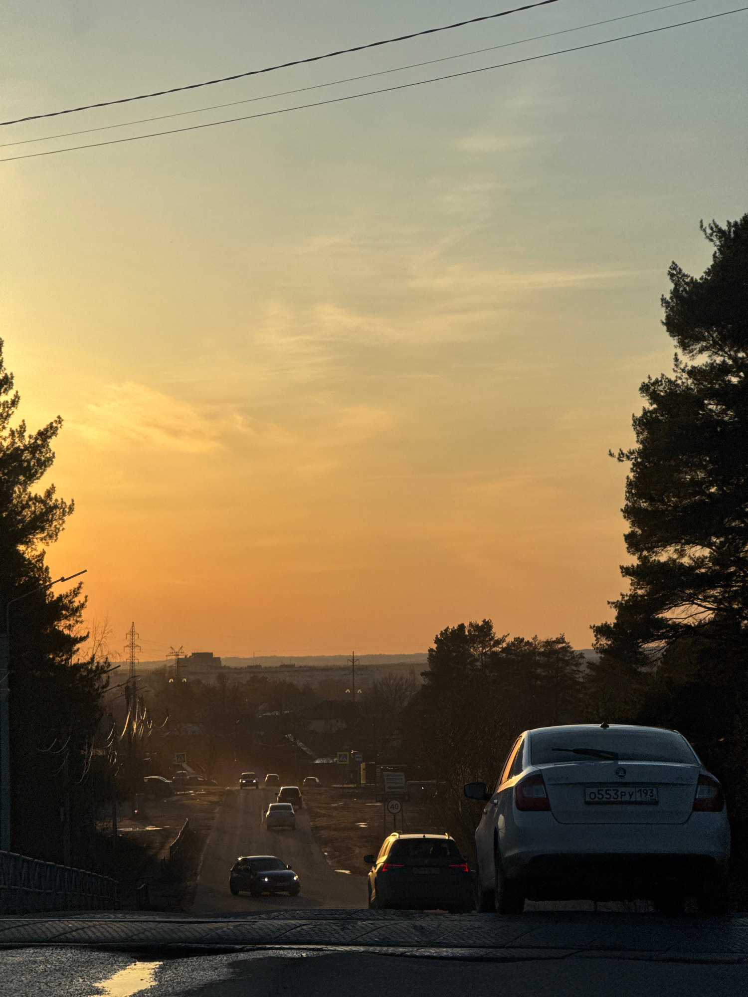 This is an outdoor shot of a cityscape. The sky, ranging from light blue to orange, indicates either sunrise or sunset. Power lines run through the top left of the shot. Trees frame the sky, providing…read more