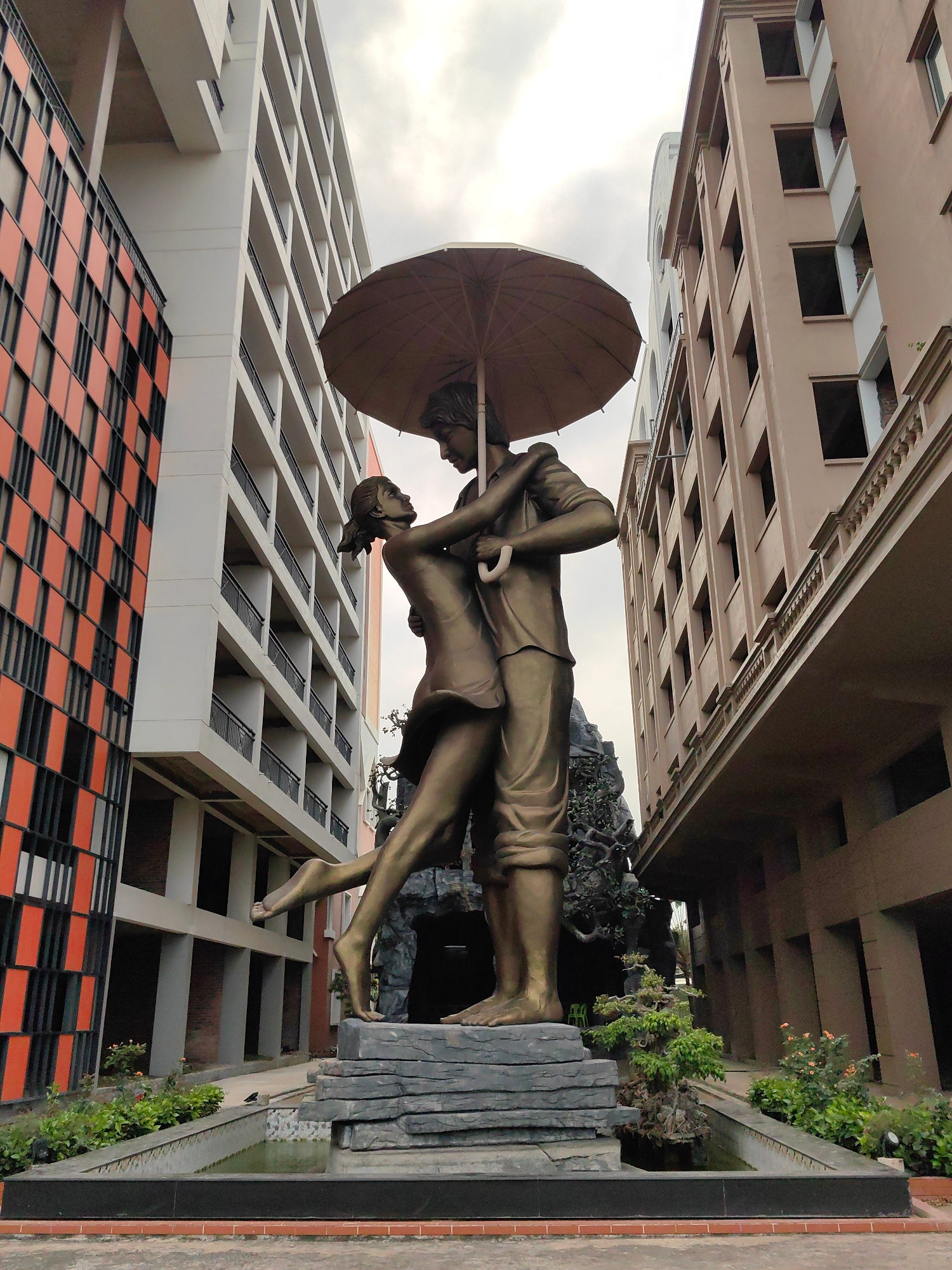 The image shows a bronze statue of a couple embracing under an umbrella, located in Tuan Chau Ward, Vietnam. The male figure is standing, while the female is leaning into him with one leg raised. They…read more