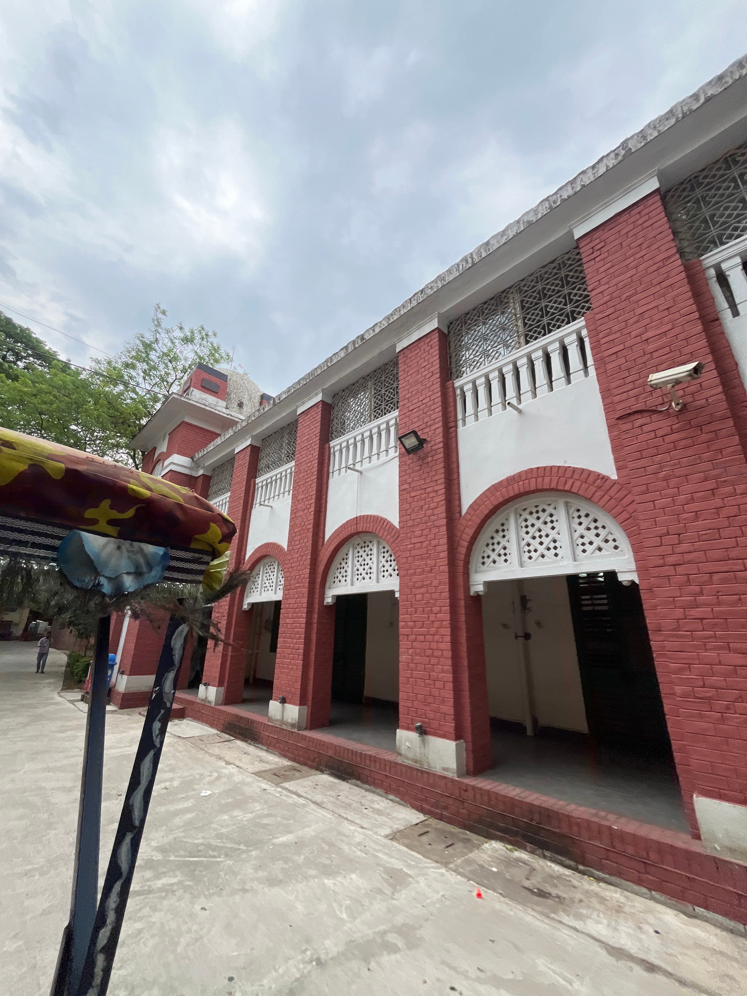 The photograph shows a brick building in Dhaka, Bangladesh. The building is two stories high, with a red brick facade and white trim. There are arched openings on the second story, and the windows hav…read more