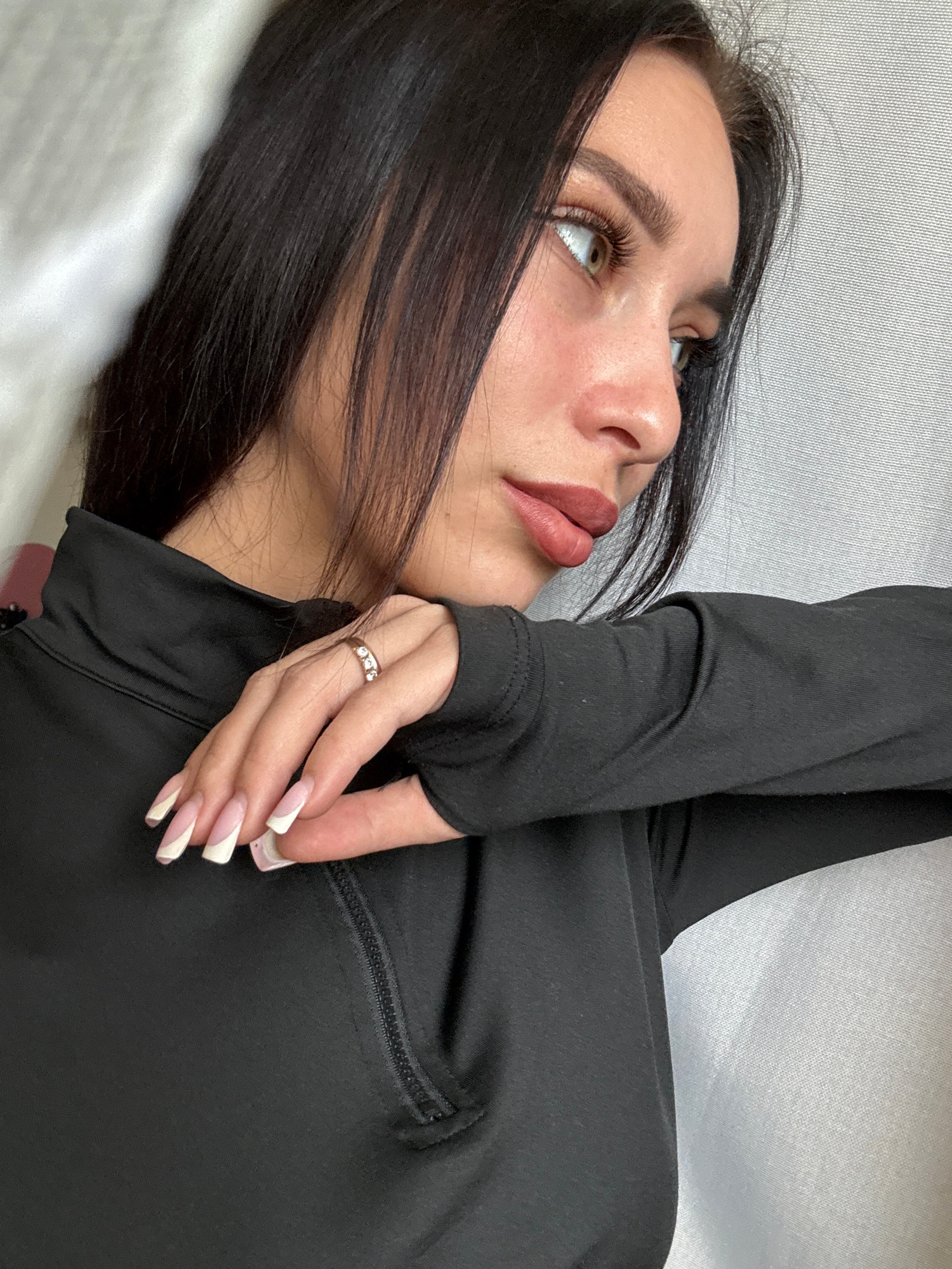This media file captures a close-up, angled portrait of a woman lying down, looking upwards and to her right. She has long, dark hair, light-colored eyes, and well-groomed eyebrows. Her lips are full…read more