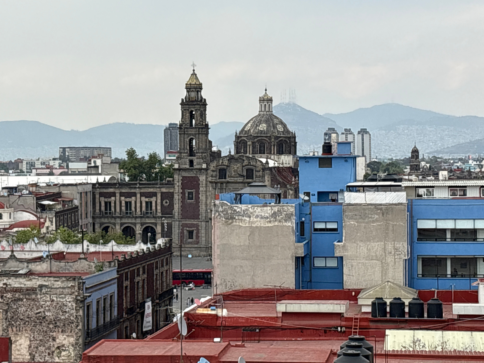 The image shows a cityscape of Mexico City, Mexico, with a focus on historical architecture juxtaposed against modern buildings. In the foreground, red rooftops support water tanks and satellite dishe…read more