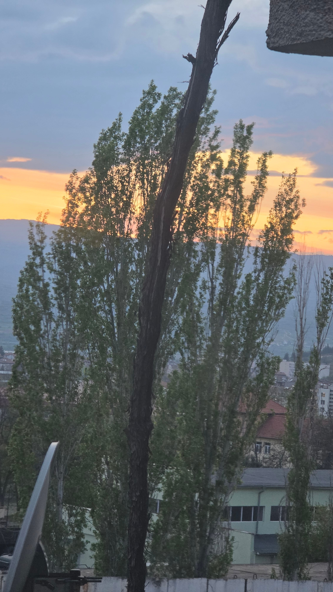 The image, oriented horizontally, captures an evening view of an urban or semi-urban landscape in Blagoevgrad, Bulgaria, illuminated by a sunset sky. The primary subject is a large, dark tree trunk wi…read more