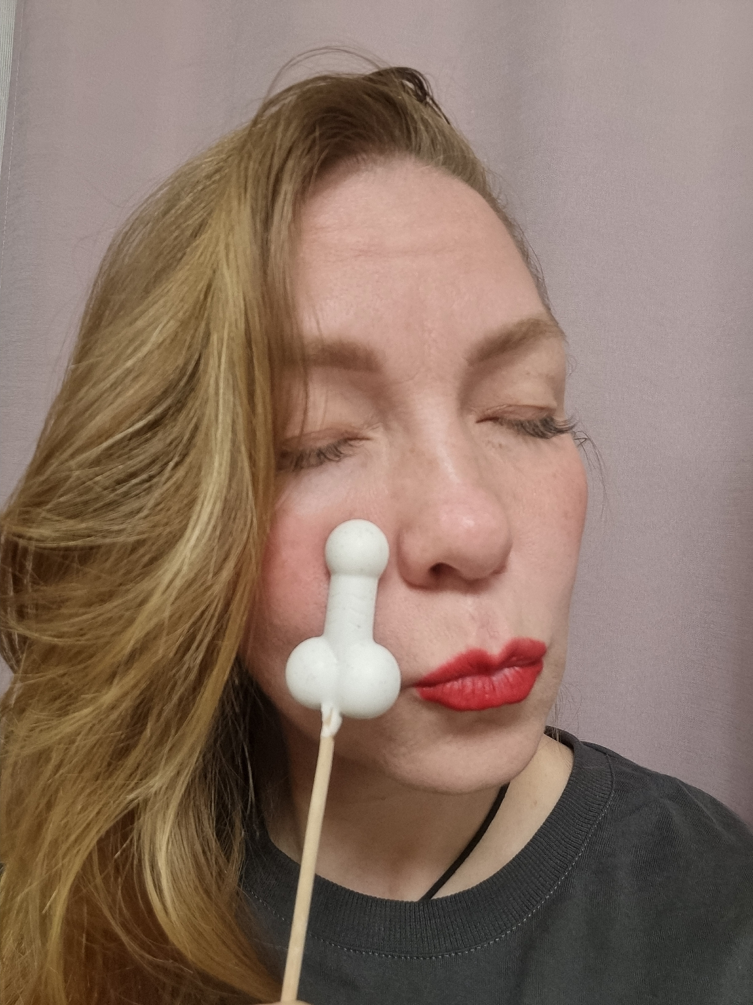 A woman with blonde hair is lying down with her eyes closed. She has red lipstick on. A white, bone-shaped object on a stick is held near her nose. The woman is wearing a gray shirt. The background is…read more