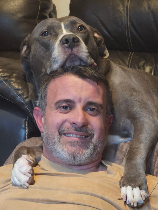 A man with graying hair and a trimmed beard lies on his back wearing a tan shirt. He smiles at the camera. A gray and white American Staffordshire Terrier dog rests on his shoulder, paws extended towa…read more