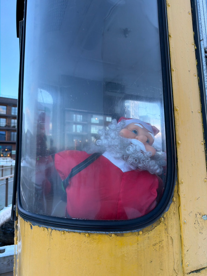 A Santa Claus plush figure is visible through the dirty, curved glass window of a weathered yellow cabin. The figure features a plastic face with blue eyes, a white mustache, and a curly white beard,…read more