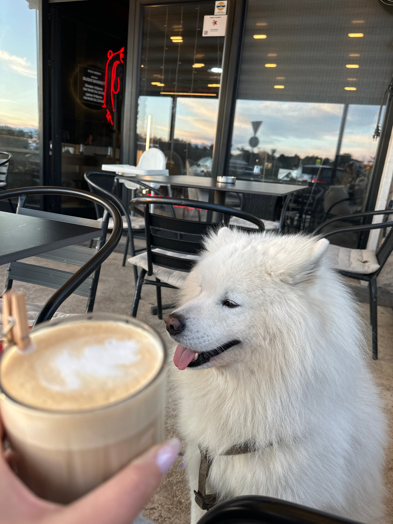 The image shows a white Samoyed dog at an outdoor cafe, with a person holding a latte in the foreground. The dog is partially visible, with its head and part of its body in the frame. It appears to be…read more
