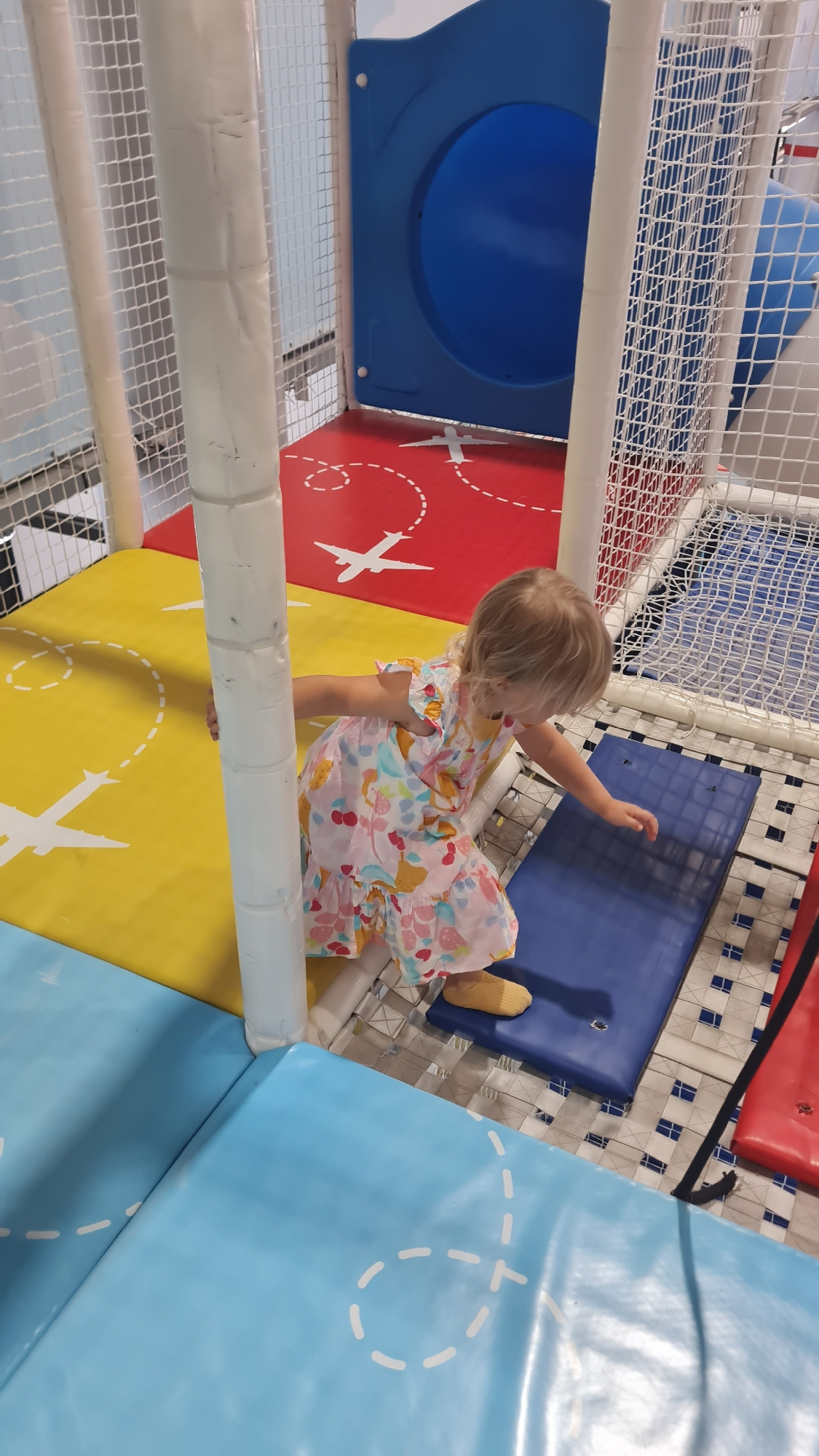 A young child with blonde hair, wearing a light-colored dress with a fruit print and yellow shoes, is seen in a play structure, likely at an indoor playground. The structure consists of a variety of c…read more