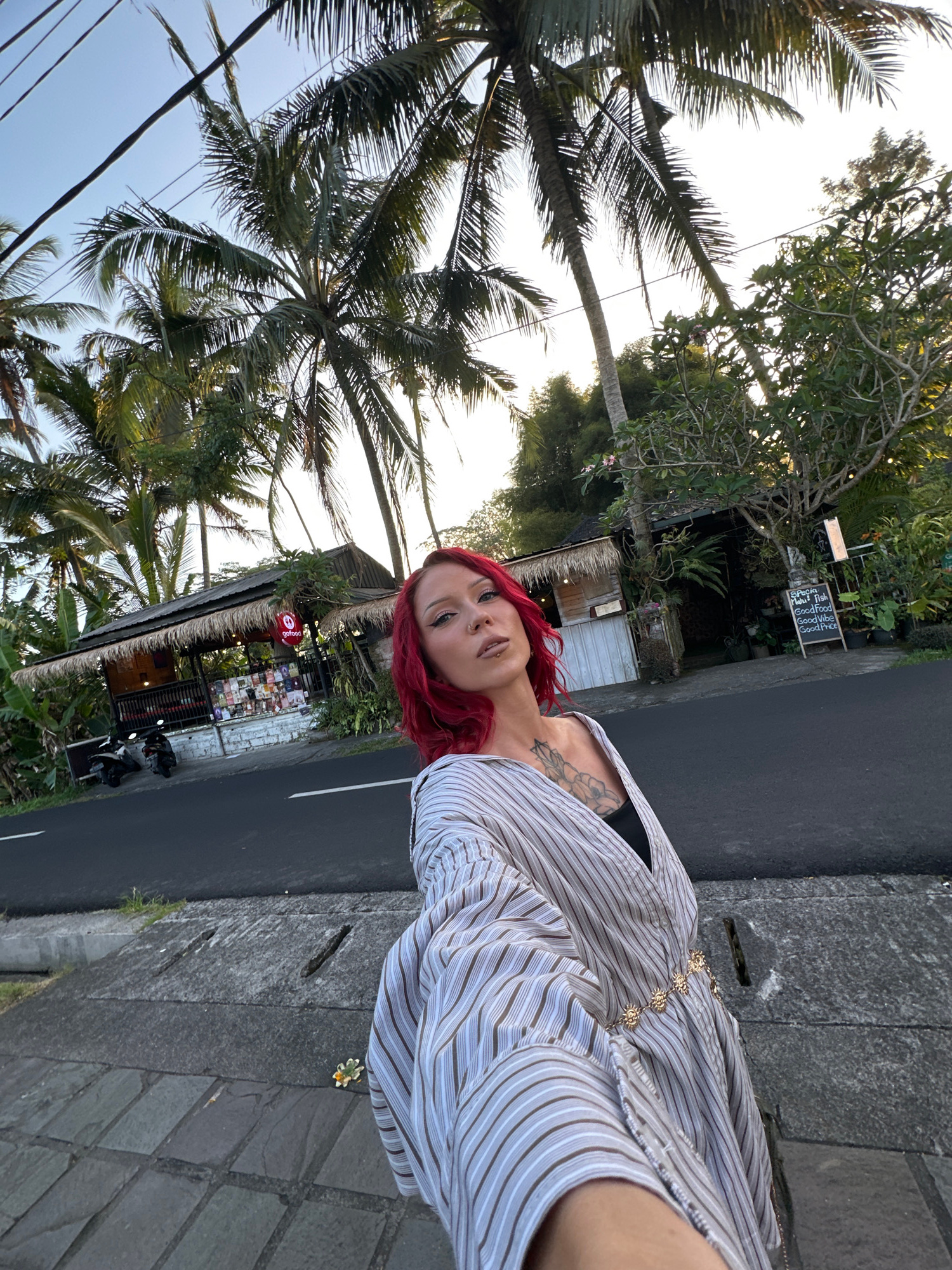 This media file captures a woman posing on a paved sidewalk in Ubud District, Indonesia, against a backdrop of tropical vegetation and local architecture. The image appears to be a landscape shot rota…read more