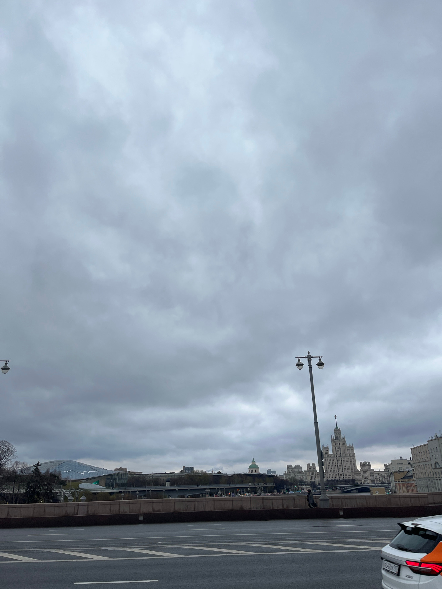 The image shows a view of Moscow, Russia from a bridge or elevated road. The sky is overcast and gray. In the background, there are several prominent buildings including the Kotelnicheskaya Embankment…read more