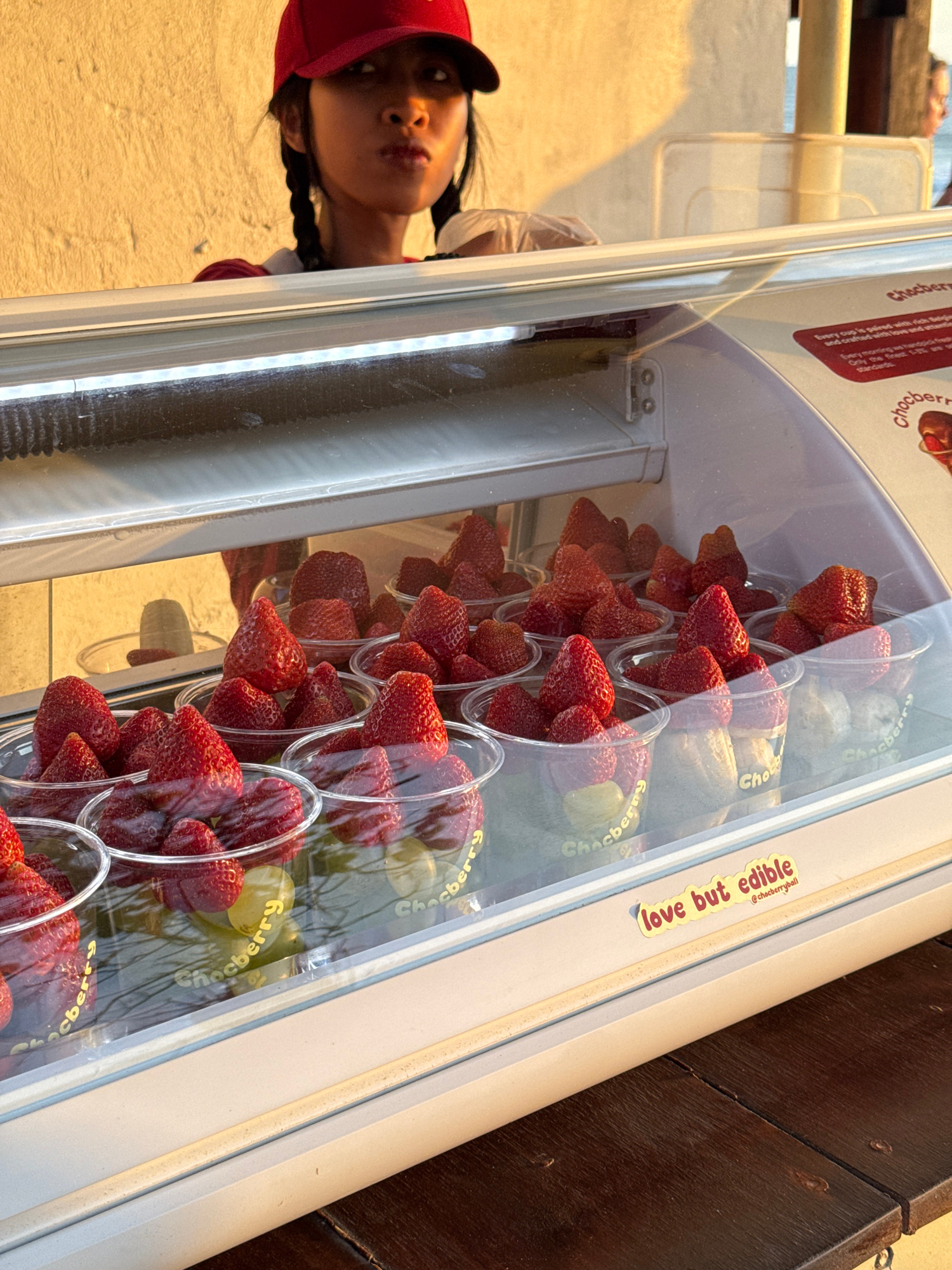 A vertical shot shows a person looking into a display case of Chocberry treats. The subject, wearing a red cap and braids, peers from the lower-left corner towards the vending-like machine stocked wit…read more