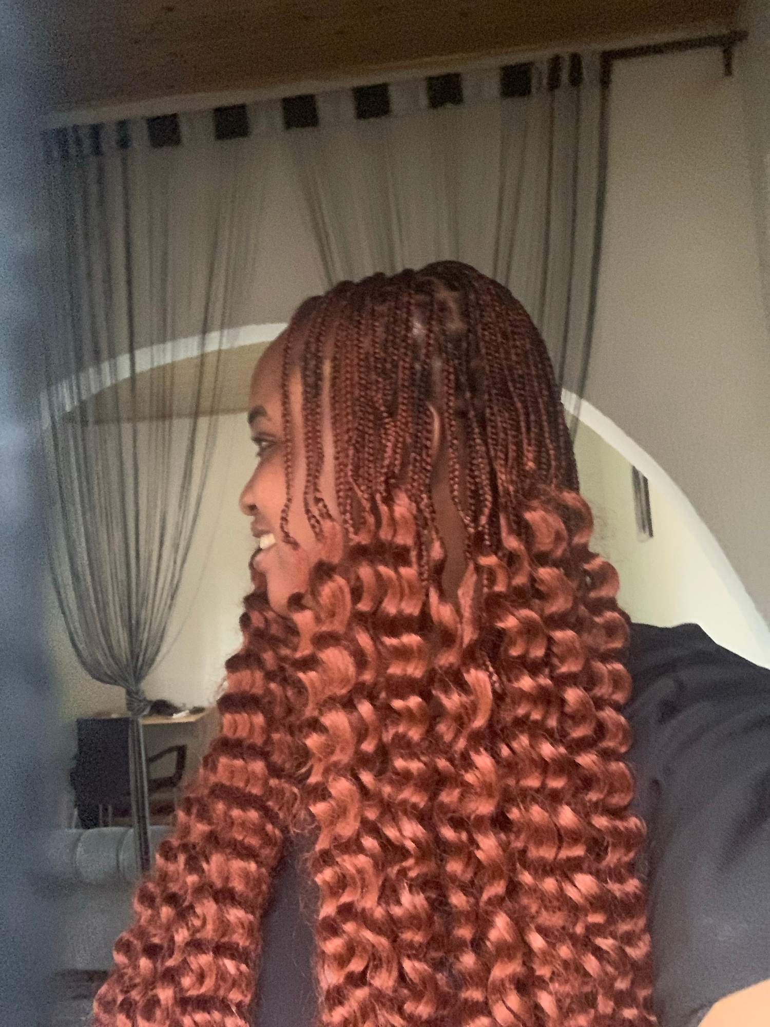 The image shows a person with copper-colored braided hair with curly ends. The hair is styled close to the scalp in neat braids, transitioning into voluminous, curly sections. The person is wearing a…read more