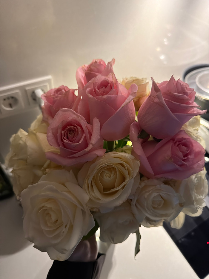 The image displays a bouquet consisting of approximately twenty cut roses, predominantly in shades of pale pink and cream-white, arranged centrally. The roses exhibit variations in bloom stage, with s…read more