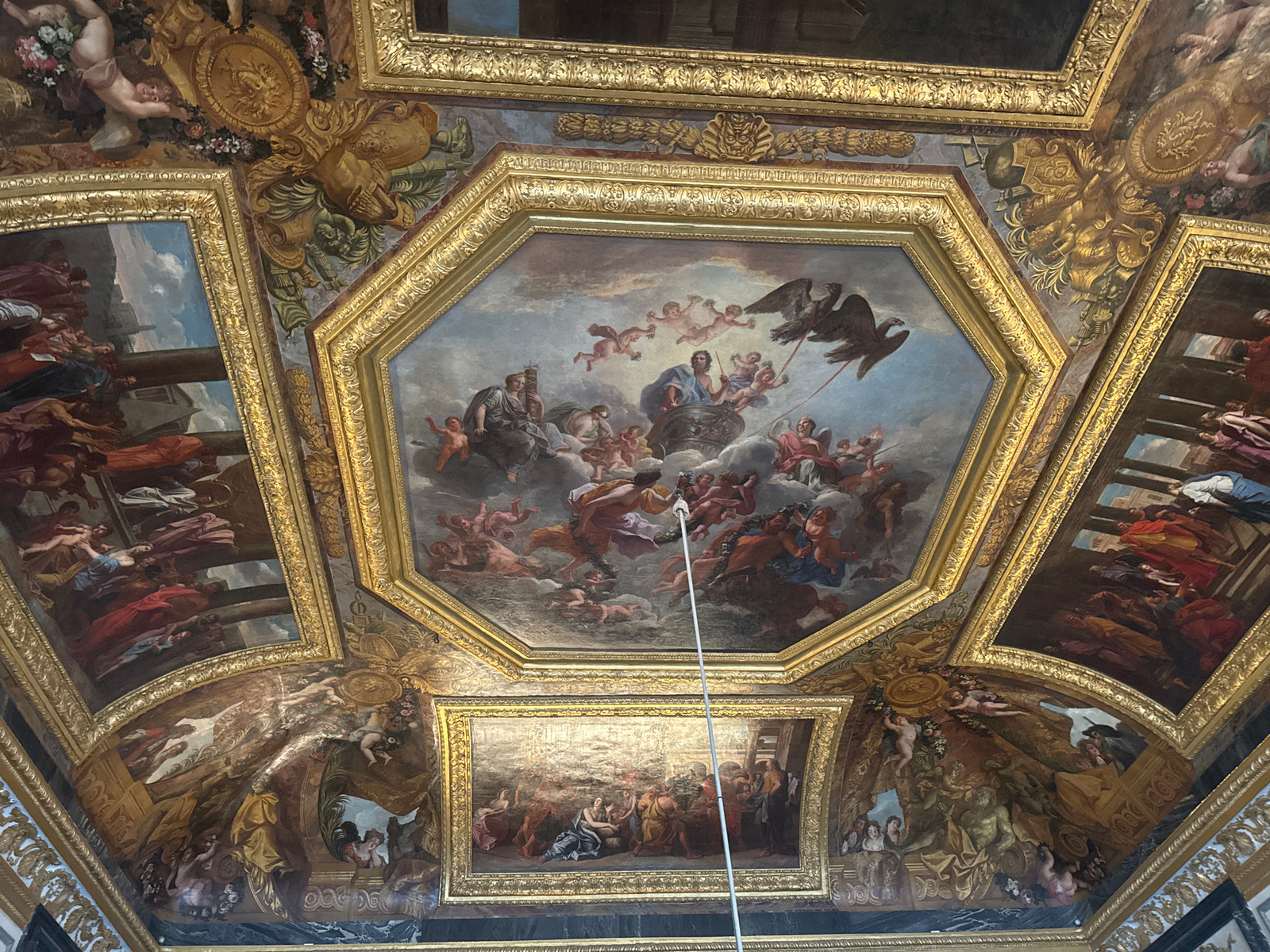 The image shows a section of the painted ceiling inside the Palace of Versailles, France. The ceiling is composed of several large, framed painted panels. The central panel is an octagon depicting a s…read more