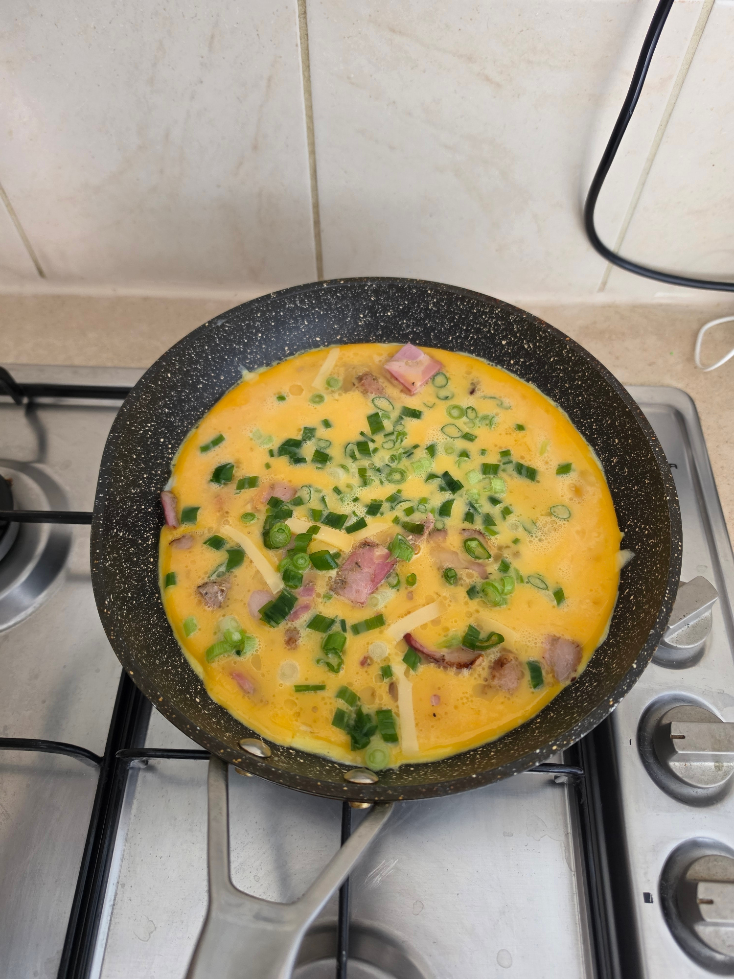 A top-down, eye-level, medium shot captures a frying pan on a stovetop. The pan is filled with a partially cooked omelet, visible with pieces of ham, shredded cheese, and chopped green onions distributed throughout the yellow egg mixture. The frying pan is black with a speckled pattern. The stovetop is stainless steel and has four burner knobs. The scene is illuminated by ambient light. The location is unknown and cannot be determined from the image. | Open Wire