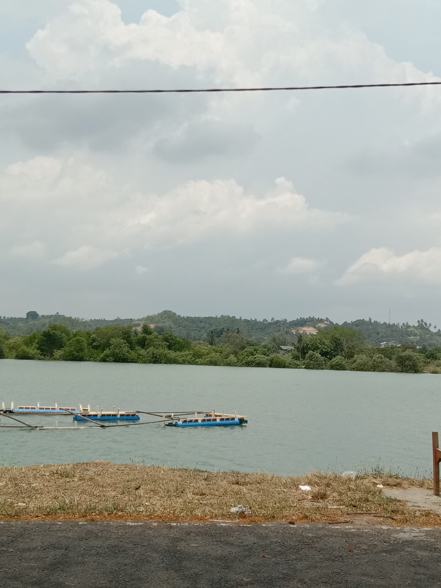 The image depicts a tranquil, overcast day at what appears to be a lake or large pond in Lhokseumawe, Indonesia. In the foreground, there's a stretch of dry, yellow-brown grass bordering a paved road.…read more