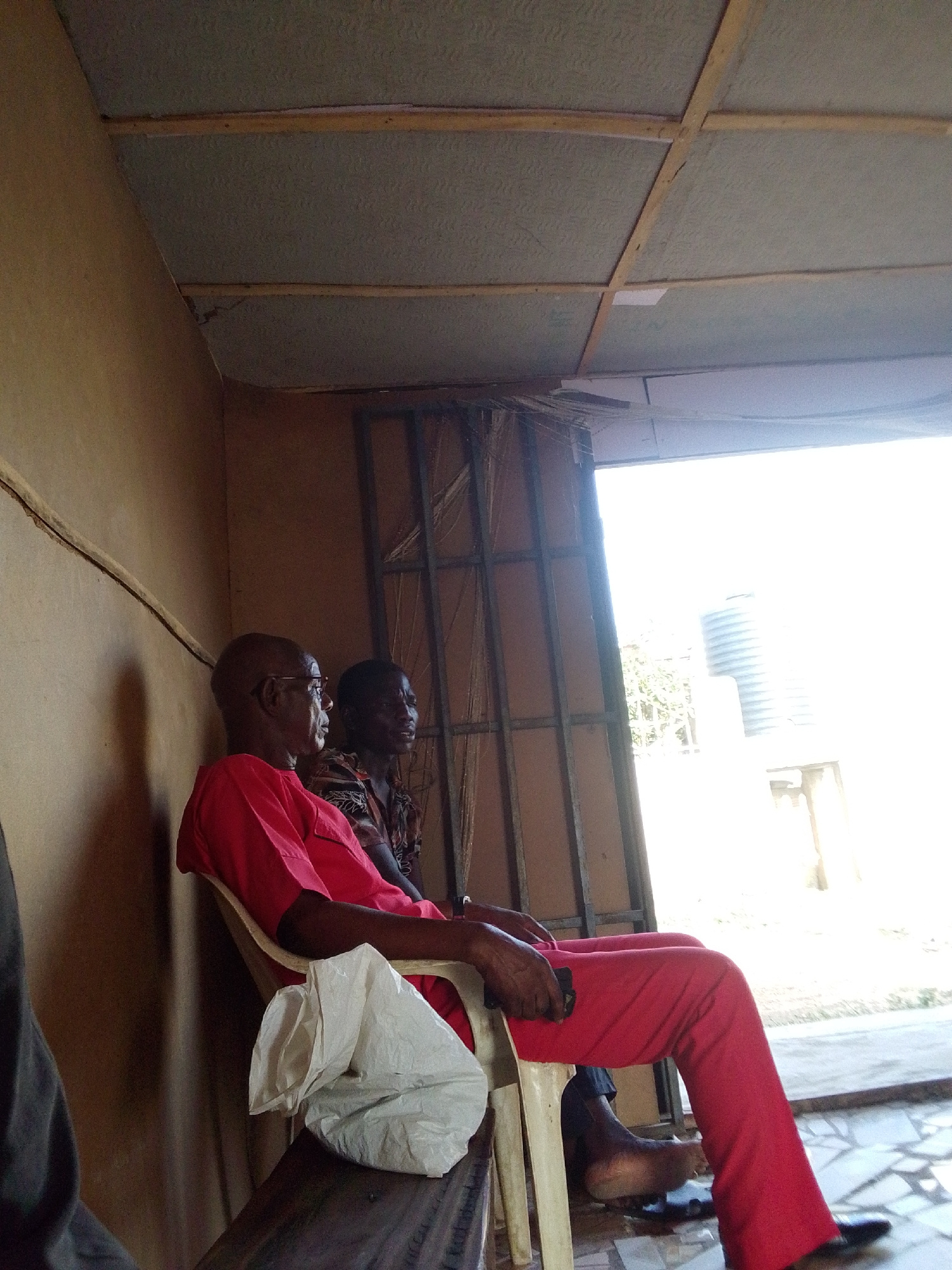 Two men are sitting in a room. The older man, wearing a red shirt and pants, is seated in a white plastic chair, with a white plastic bag on the bench to the side. The other man is in a patterned shir…read more