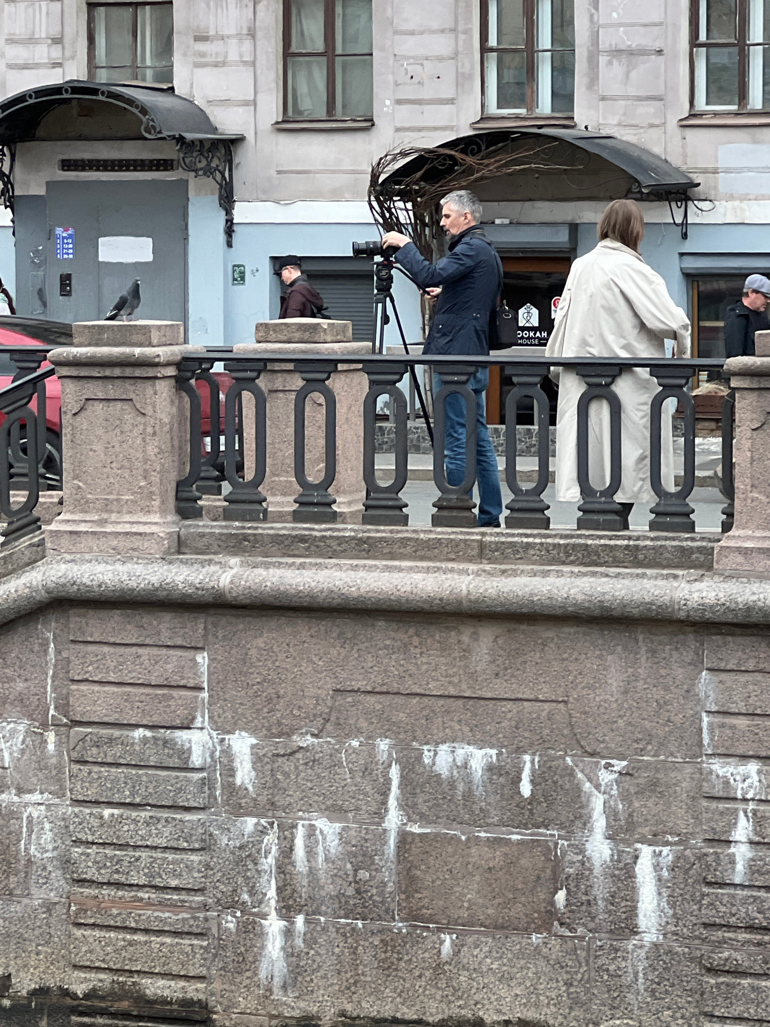 An outdoor scene in Saint Petersburg, Russia, captured during the daytime, depicts a photography or filming session in an urban setting. In the foreground, a coarse, grey-brown stone surface with pro…read more