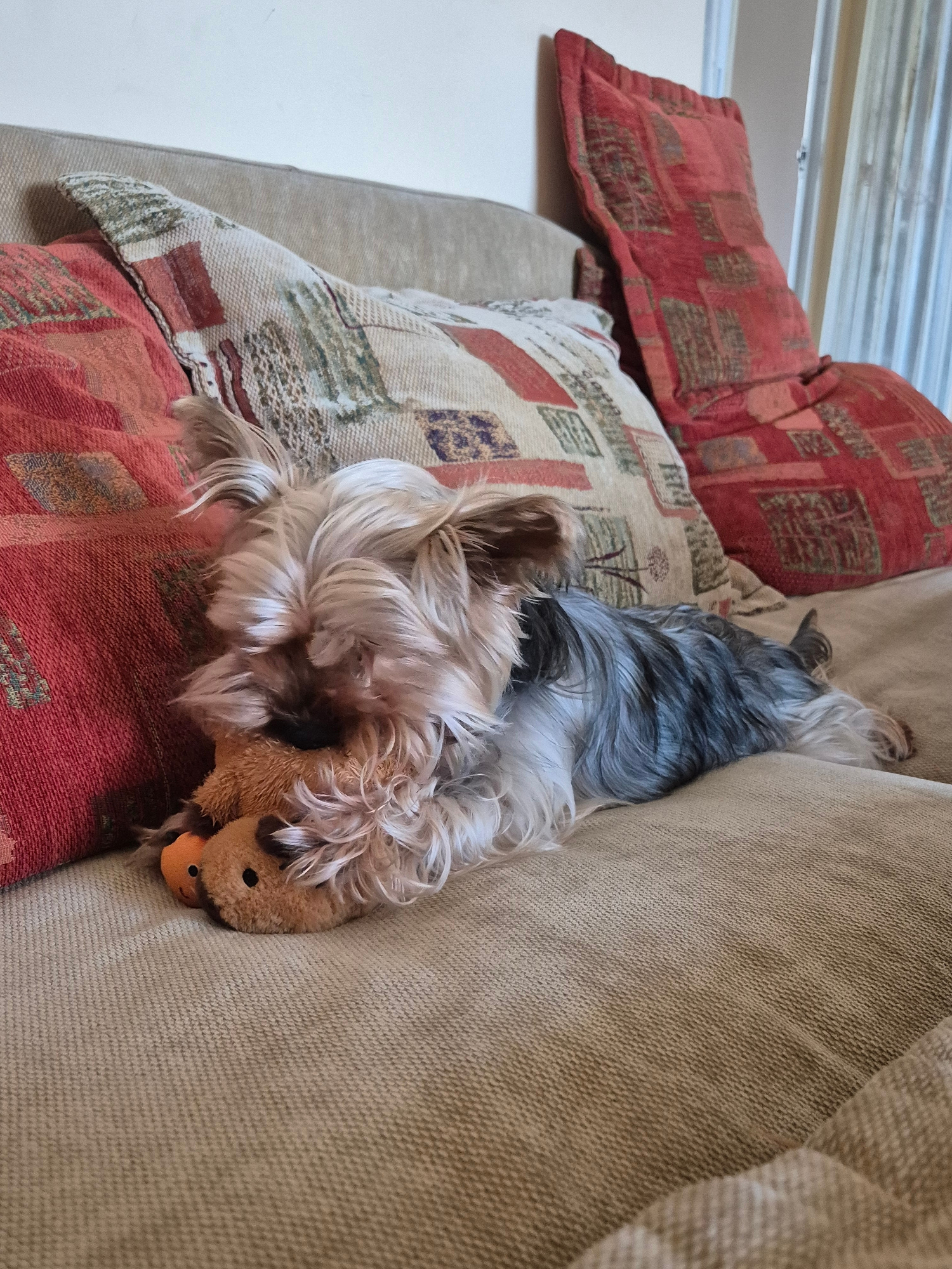 A Yorkshire terrier dog is lying on a beige couch, resting its head on a plush toy. The dog is positioned amongst several patterned throw pillows. The environment appears to be inside a building. Ther…read more