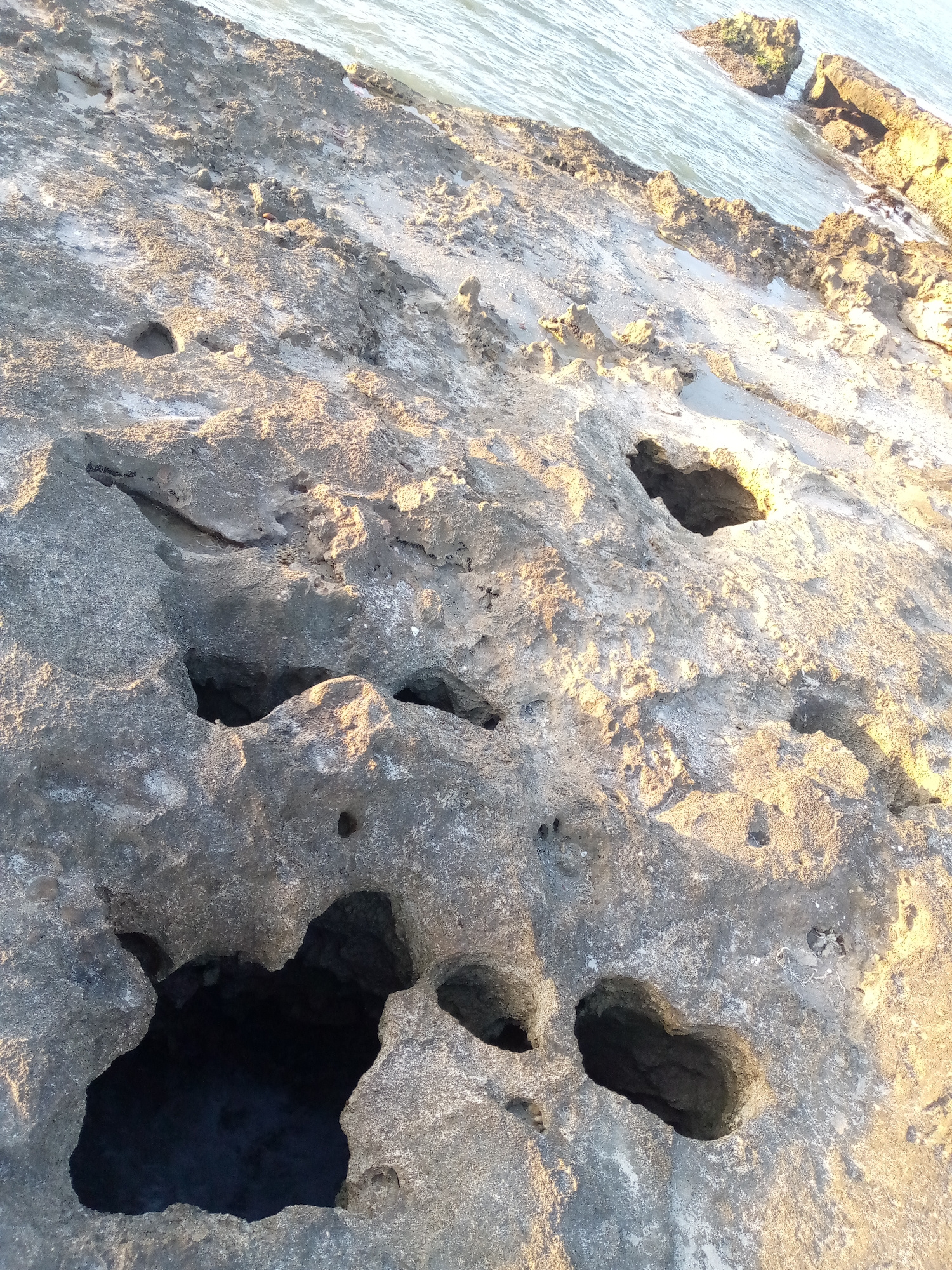 The image shows a rocky coastline with several large holes eroded into the rock. The color of the rock is mostly gray, but parts are brightly lit, likely by the sun. In the upper right portion of the…read more