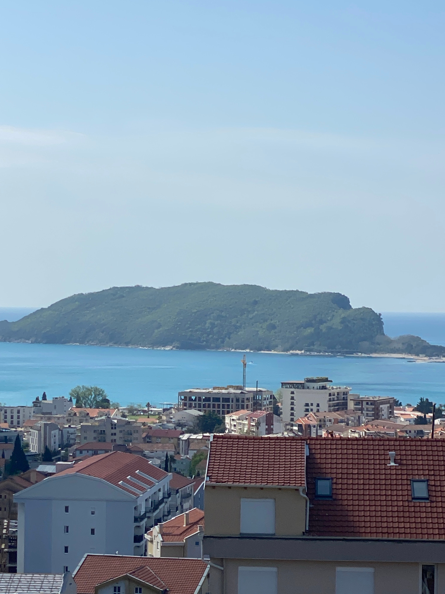 This panoramic image depicts a picturesque coastal city, consistent with the location context of Budva, Montenegro, under a clear, bright sky. The perspective is elevated, looking across an urban land…read more