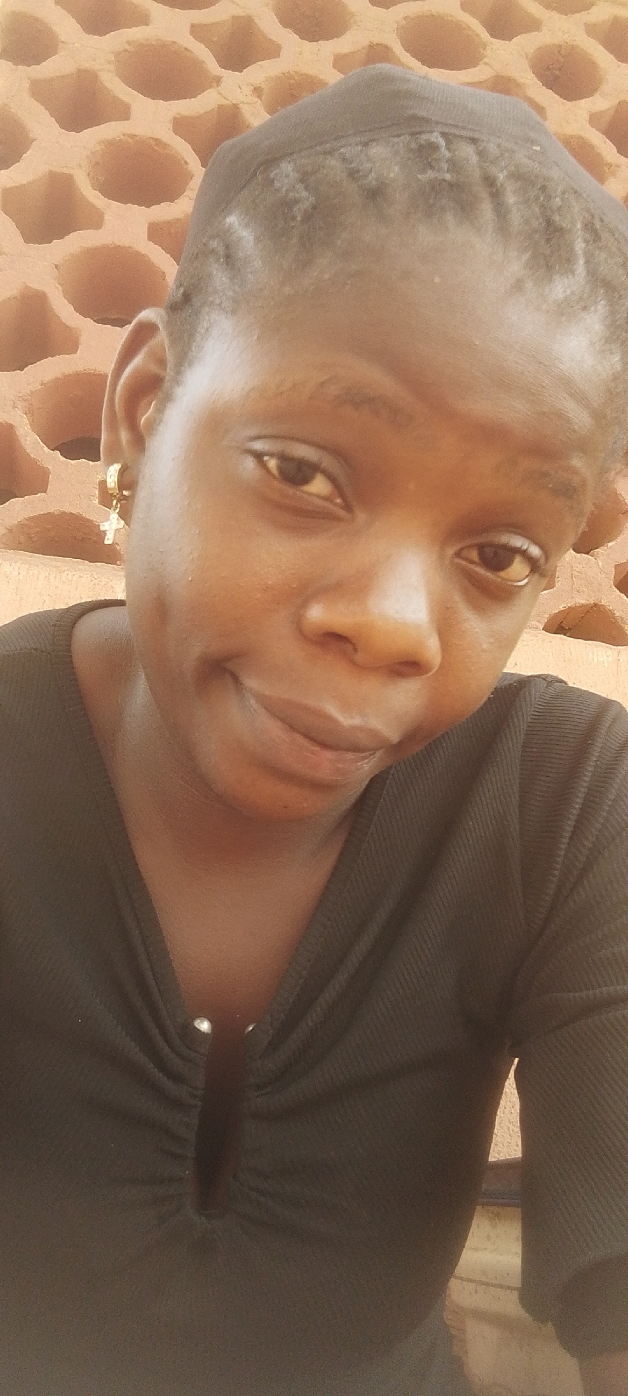 A medium shot depicts a young woman with dark skin, looking directly at the camera with a slight smile. She is wearing a close-fitting black top with small silver embellishments at the neck. Her hair…read more